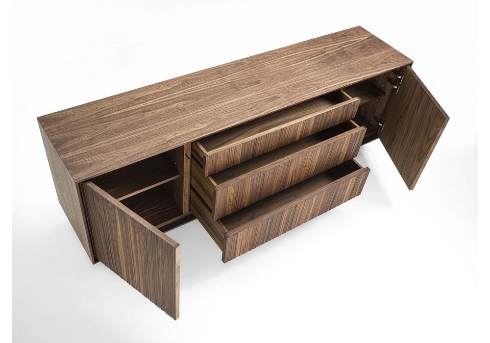 Vela Sideboard firmata da Riva 1920 è una credenza in legno massello e listellare, caratterizzata da una particolare lavorazione verticale di ante e frontali dei cassetti, Fresart, che crea un effetto geometrico moderno e dinamico. Cassetti assemblati con incastri a coda di rondine. Disponibile anche con frontali lisci.