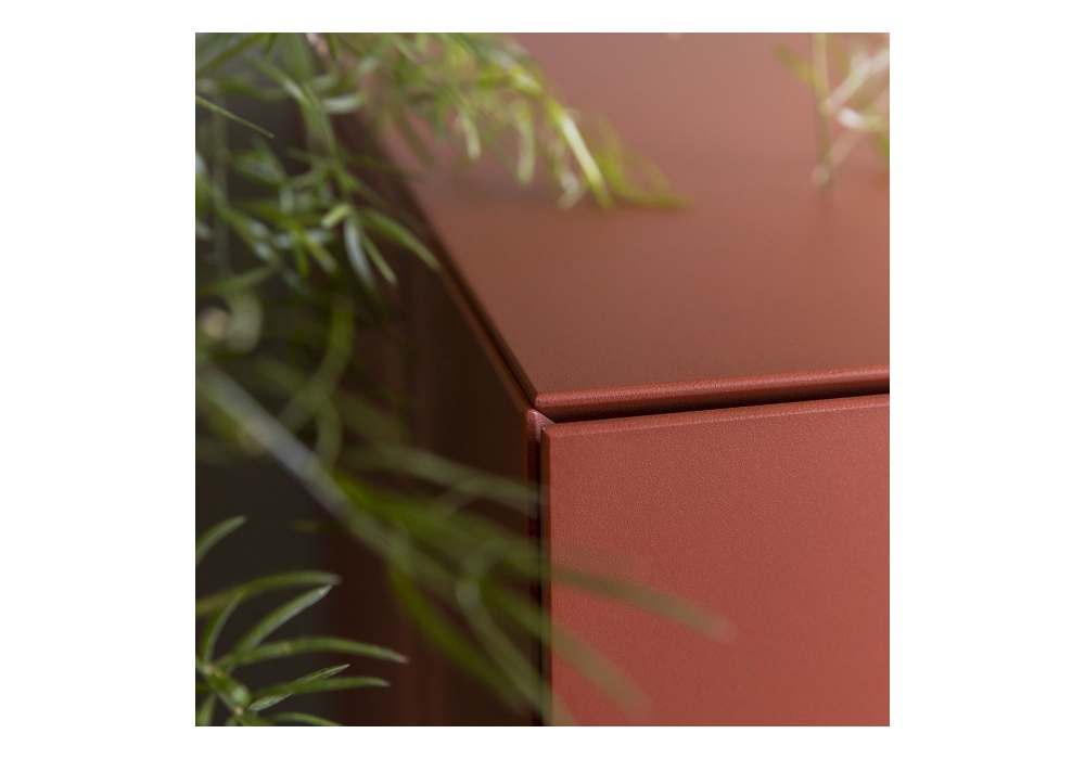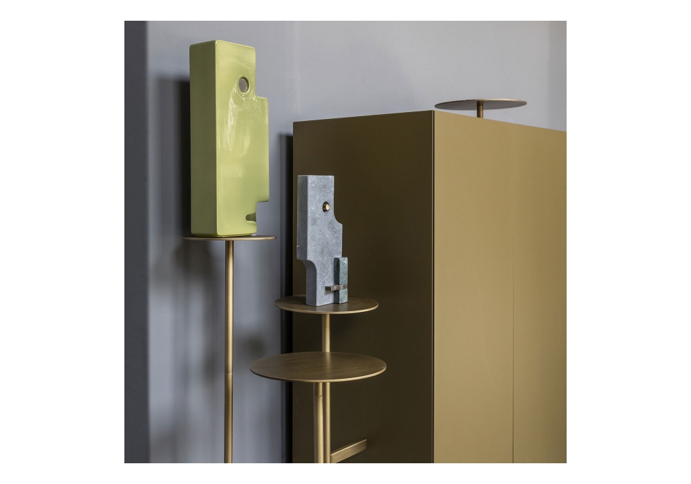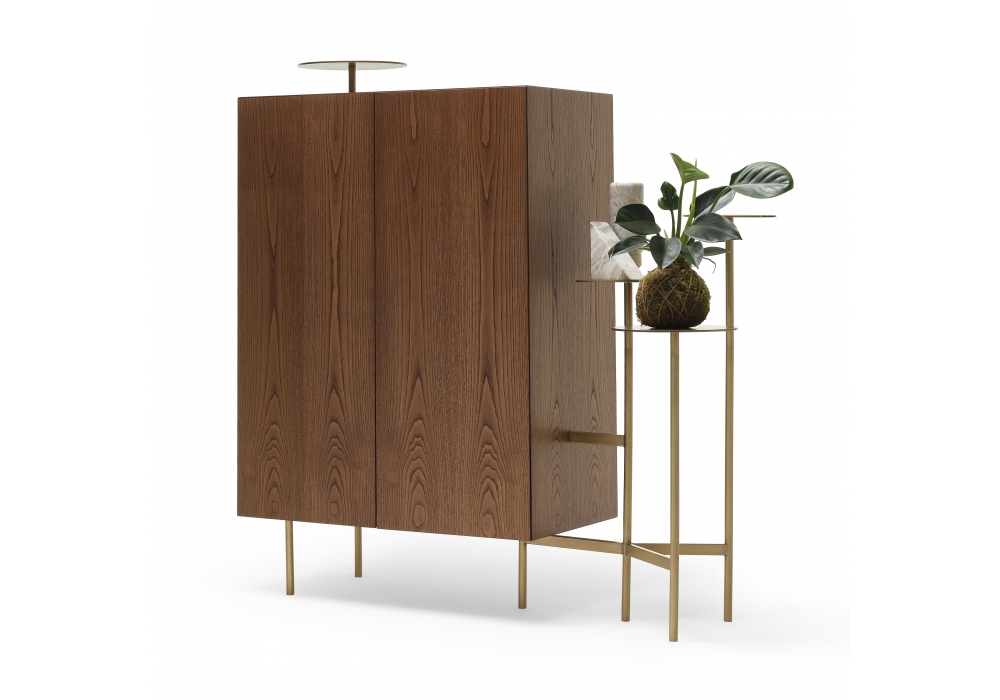 Ikebana firmata da Uto Balmoral per Mogg è un mobile contenitore con struttura in MDF e telaio in metallo, completa di 3 ripiani interni in cristallo. Disponibile laccato goffrato oppure placcata in olmo finitura castagno. Il telaio in metallo include 3 piani d’appoggio con diametro cm 32, 25, 28 ed è disponibile verniciato brunito oppure bronzo patinato.