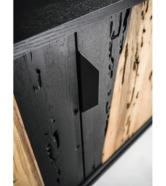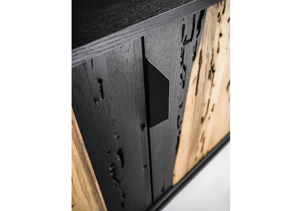 Fire Low firmata da Marco Piva per Riva 1920 è una madia in legno massello e listellare, caratterizzata da scocca e zoccolo in rovere pigmentato total black. Munita di quattro ante a battente in legno d Briccola (con porzioni sagomate total black) con maniglia sporgente in ferro, che racchiudono centralmente tre cassetti assemblati con incastri a coda di rondine, di cui uno con frontale pigmentato total black.