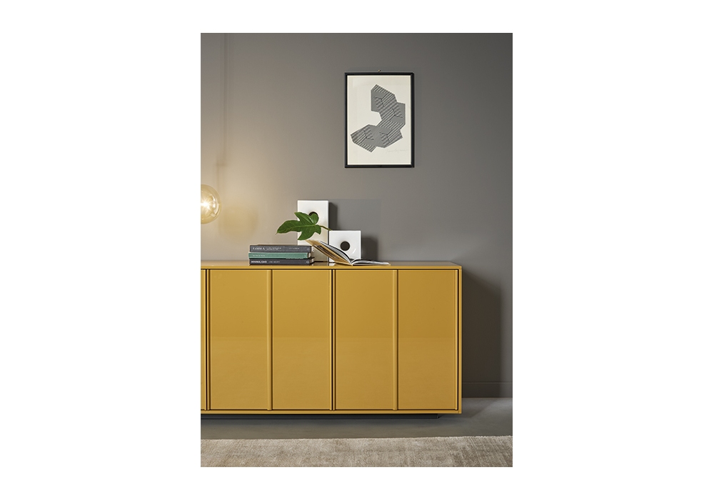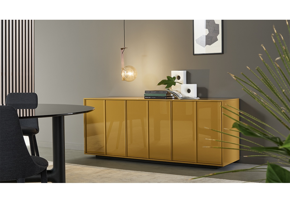 Backdrop firmata da Alain Gilles per Bonaldo è una madia disponibile in due dimensioni, con struttura in legno impiallacciato noce canaletto oppure legno laccato lucido color caramello. La base a zoccolo è in metallo nero.