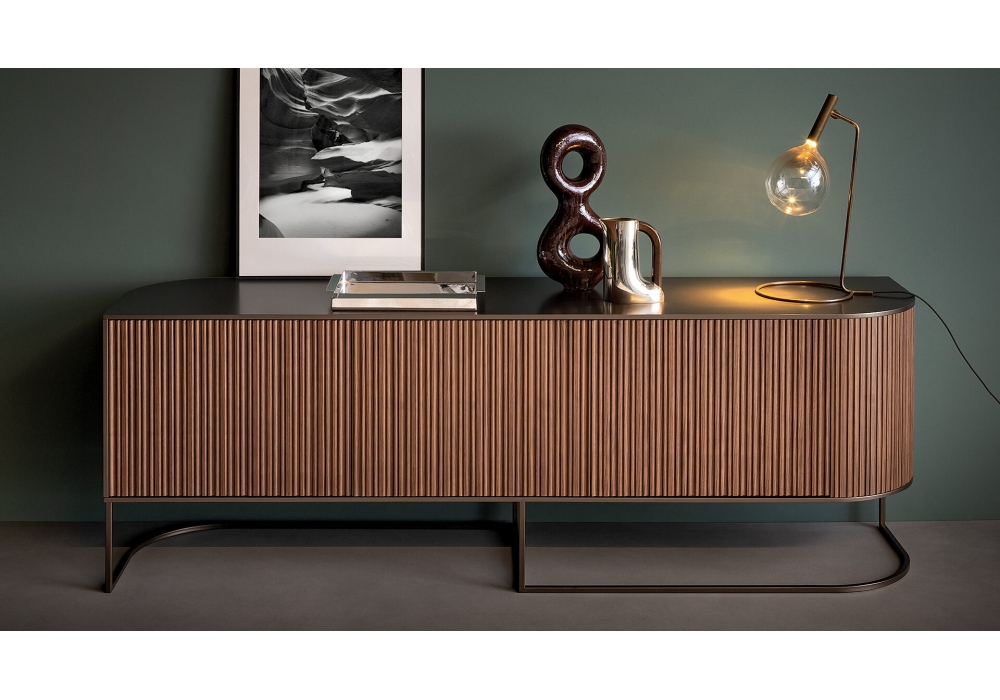 Dune firmata da Giuseppe Viganò per Bonaldo è una madia con struttura esterna in legno laccato, ante in legno impiallacciato, base in metallo verniciato e piano in ceramica o marmo. Disponibile in diverse finiture.