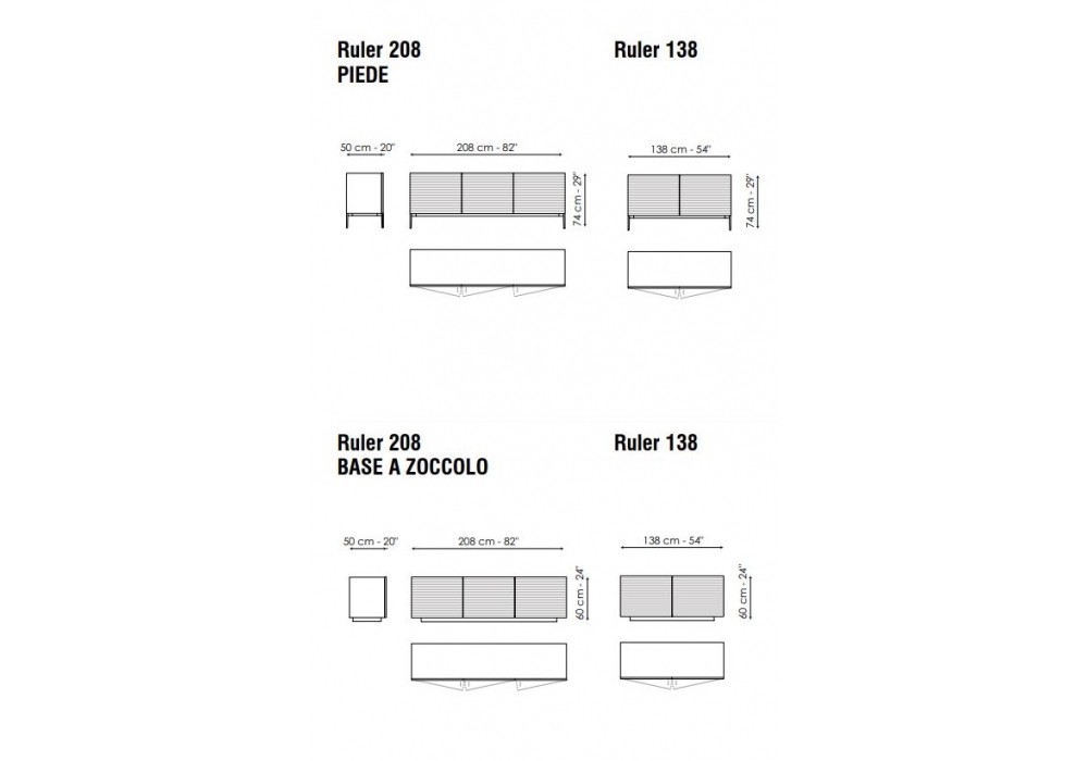 Ruler firmata e prodotta da Bonaldo è una madia con struttura esterna in legno laccato opaco, ante in alluminio verniciato e base in metallo, disponibile in due dimensioni e in due combinazioni di colore: bronzo o piombo. La madia è realizzata con base a zoccolo o con piedi. I ripiani interni sono in legno nobilitato (su richiesta, disponibili anche in cristallo trasparente).