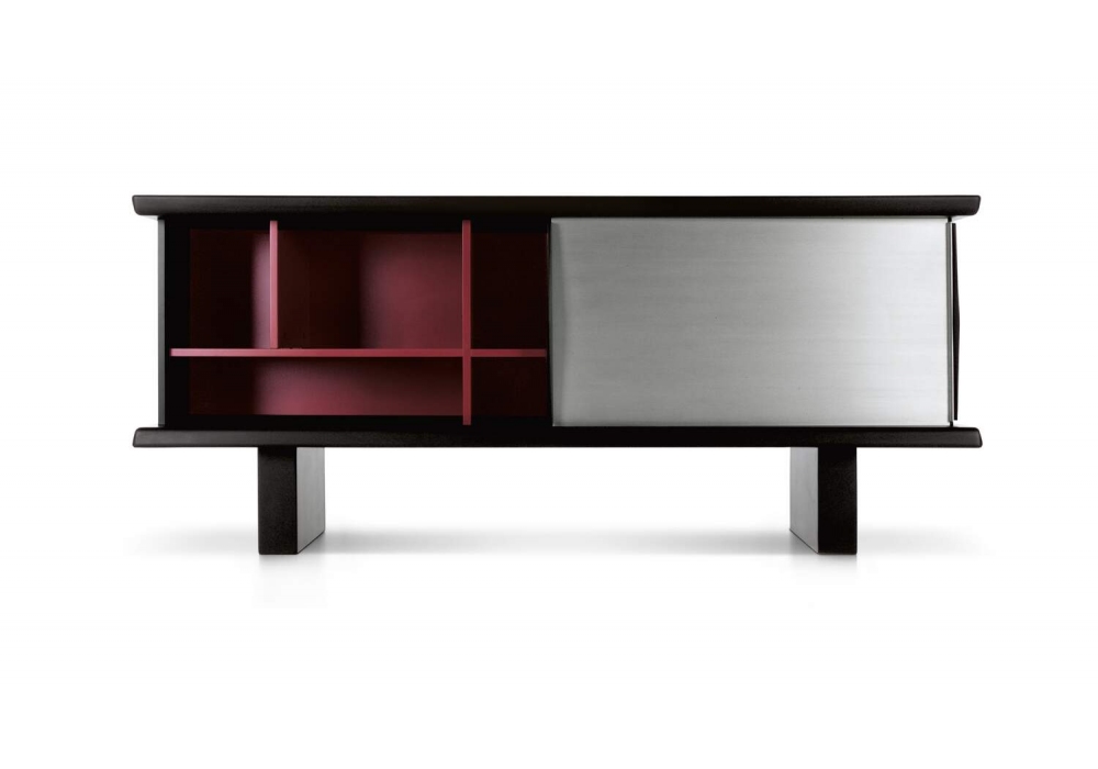 513 Riflesso firmato da Charlotte Perriand per Cassina è un mobile contenitore con struttura/gambe in legno MDF, ante e ripiani in lamiera d'alluminio anodizzato e maniglie in massello di faggio. Versione laccata nero esternamente, bordeaux internamente; versione in massello di mogano, fianchi in mogano, schienale e interni neri.