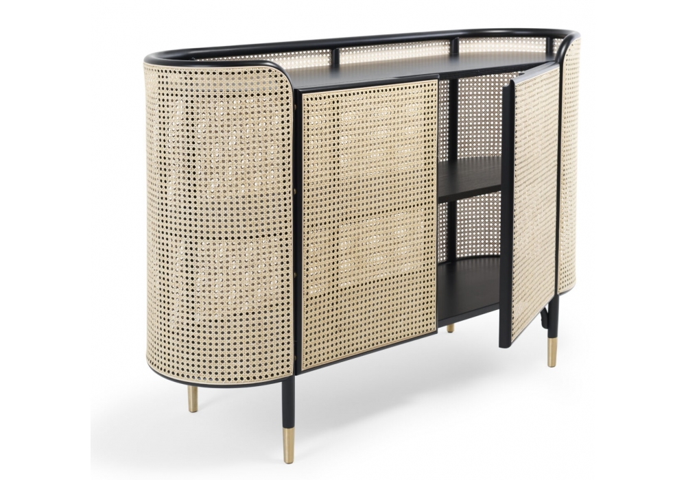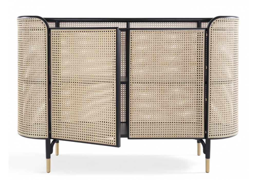 Mos Cabinet firmato da Gamfratesi per Gebrüder Thonet Vienna è un mobile contenitore con struttura in faggio curvato, pannelli laterali e posteriori in paglia di Vienna. Ripiani in frassino e puntali in ottone. Struttura e ripiani disponibili in diverse finiture.