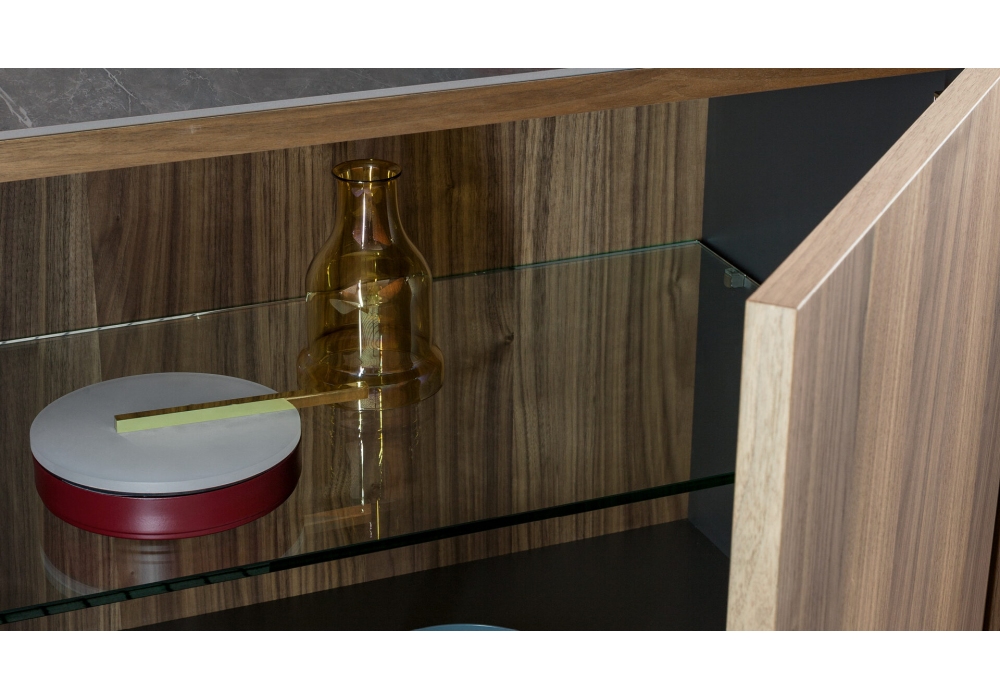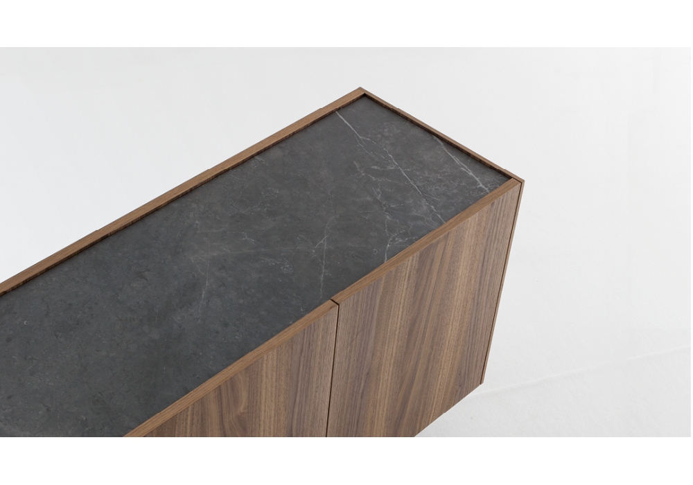 Outline firmata da Mario Mazzer per Bonaldo è una madia con struttura in legno impiallacciato noce canaletto. La base è in metallo verniciato in diversi colori. Il piano è leggermente incassato, in noce canaletto come la struttura oppure con un piano aggiuntivo in ceramica. Disponibile in vari modelli.