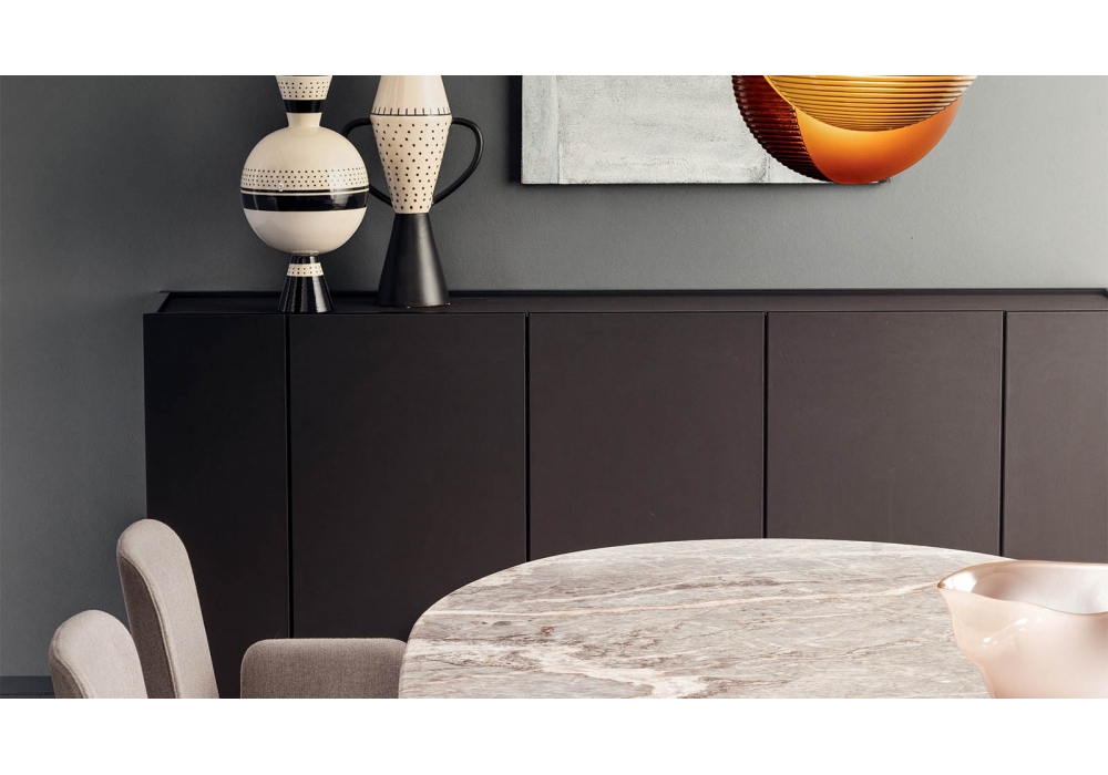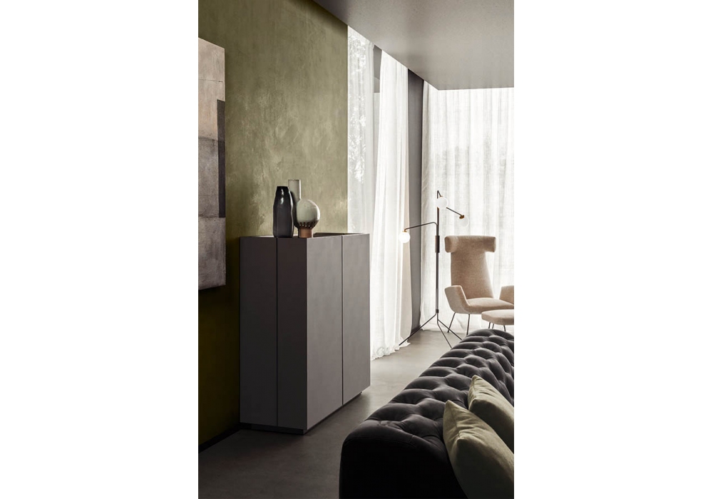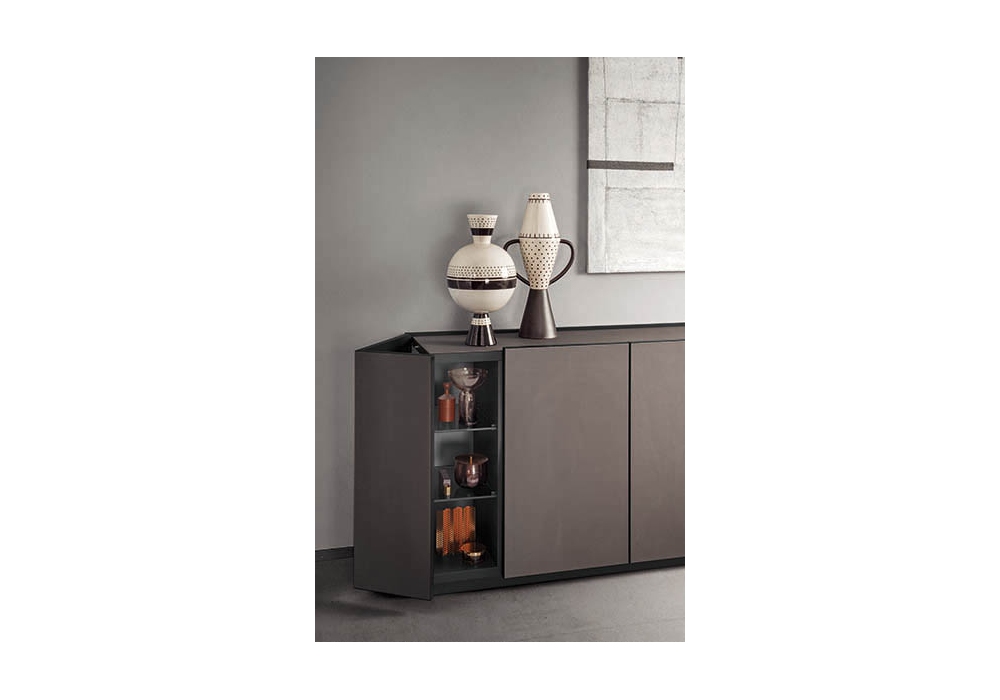 Cornice firmata da Pianca è una madia con apertura a scrigno delle ante laterali esterne. Realizzata in legno Essenza o laccato oppure rivestita in pelle sintetica, zoccolo nella finitura lavagna opaco e ripiani interni realizzati in vetro trasparente piombo. Disponibile in diversi modelli.