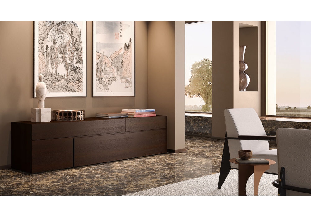 Quadra firmata da Pianca è una madia pensile o "a terra" realizzata con struttura con pannelli in particelle di legno in Essenza oppure laccato lucido o opaco e ripiani interni in vetro trasparente piombo temperato. Disponibile in diversi modelli.