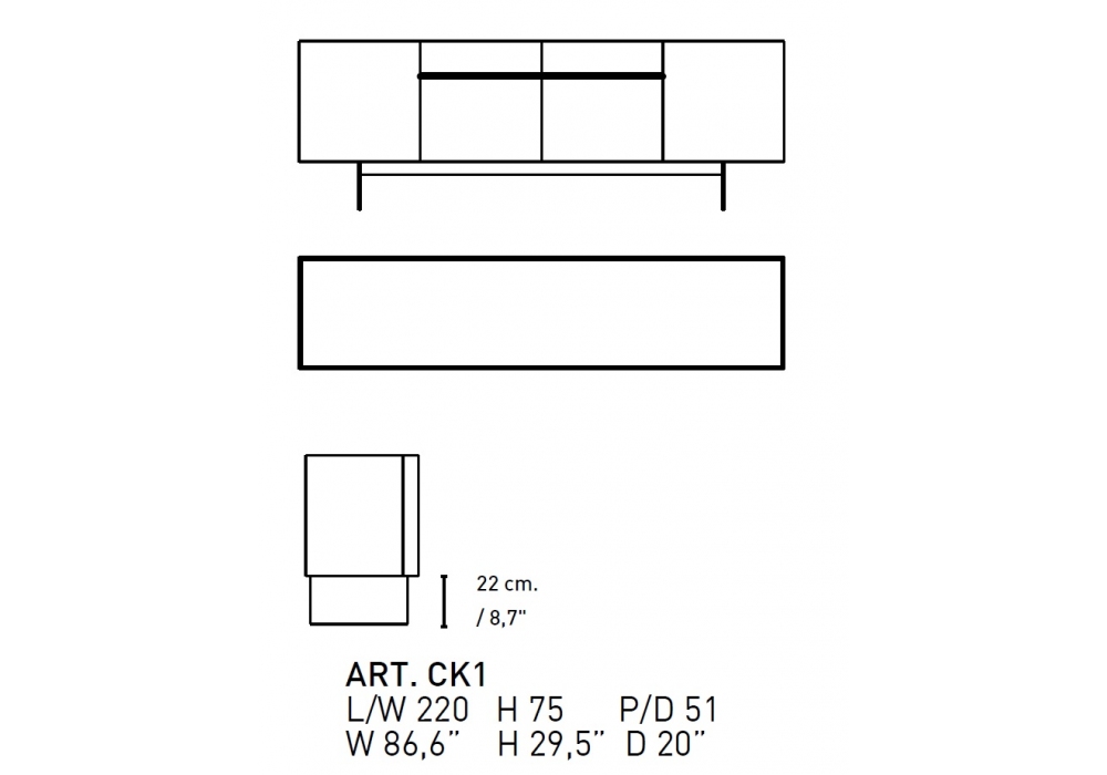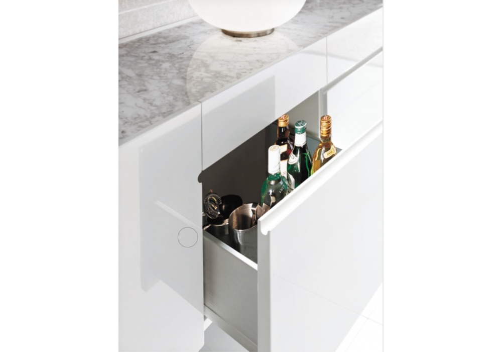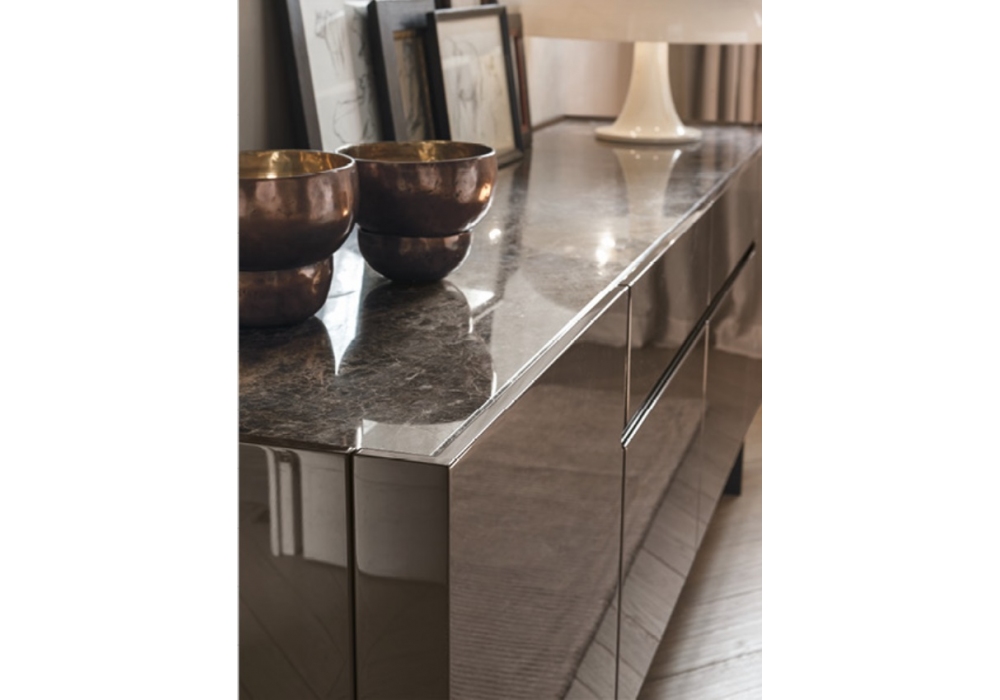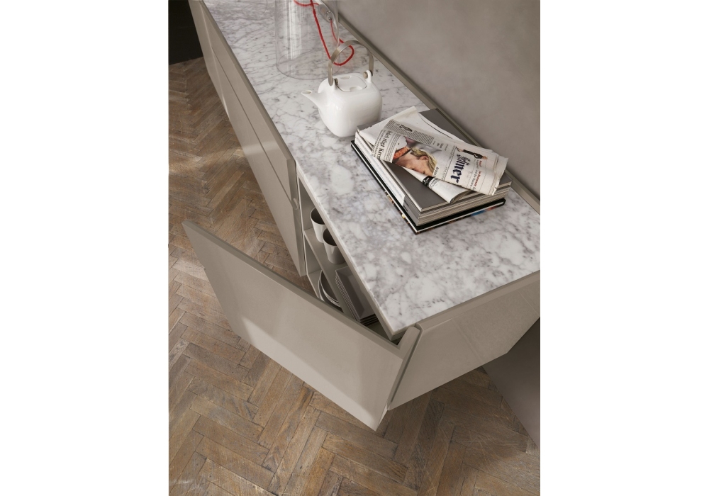 Kubit firmata da Giuseppe Bavuso per Alivar è una credenza in MDF laccato con quattro cassetti e due ante laterali. Piano in marmo o in ceramica accoppiata con vetro trasparente extra chiaro. Base in alluminio spazzolato o verniciato.