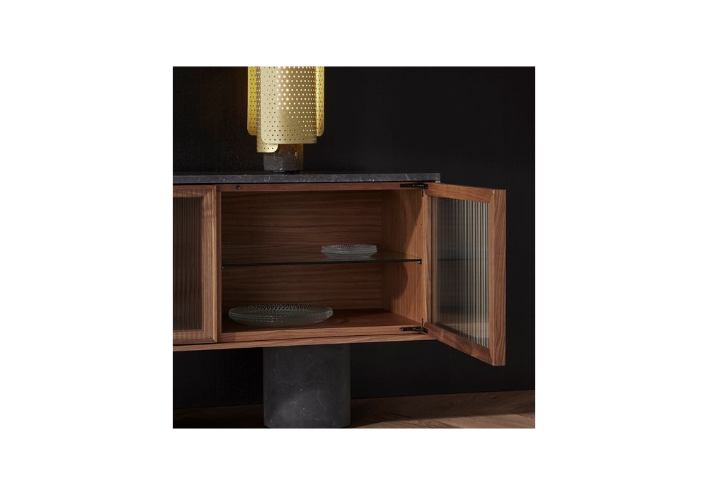 Rio firmata da Sebastian Herkner per Punt è una madia con struttura in MDF con impiallacciatura in legno di rovere o noce, piano e piedi/base in legno o in marmo Marquina. Ante a battente senza maniglie realizzate in legno massiccio di rovere o noce e vetro temperato ondulato. Ogni modulo comprende un ripiano interno in vetro temperato con fissaggio al centro.