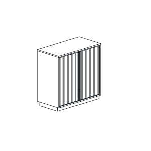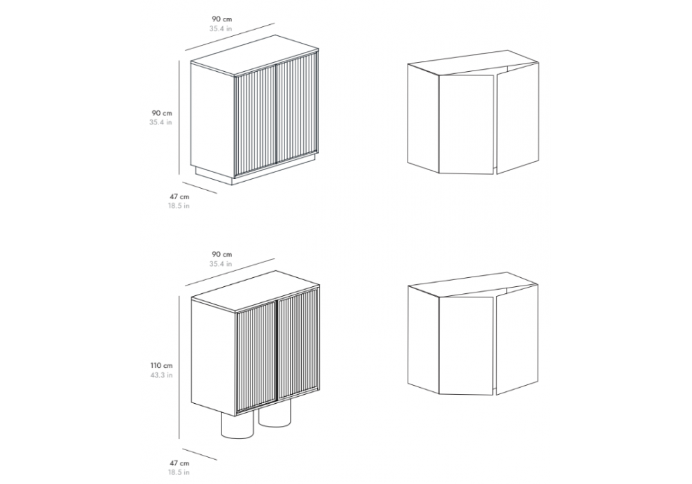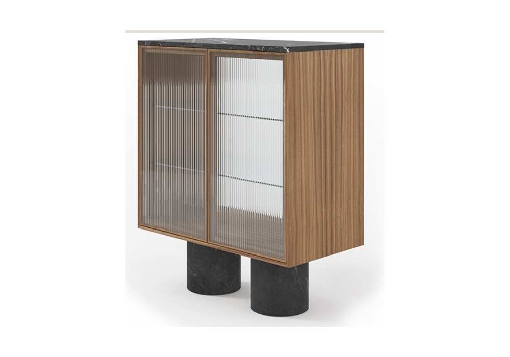 Rio firmata da Sebastian Herkner per Punt è una credenza con struttura in MDF con impiallacciatura in legno di noce, piano e piedi in marmo Marquina ed ante a battente senza maniglie realizzate in legno massiccio e vetro temperato ondulato. Ogni modulo comprende un ripiano interno in vetro temperato con fissaggio al centro.