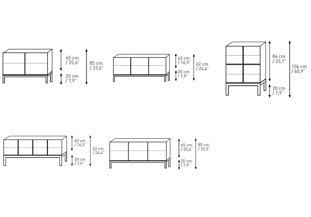 | Dimensioni | 126 x 42 x H 62 cm; 168 x 42 x H 62 cm; 84 x 42 x H 104 cm; 130 x 42 x H 85 cm; 195 x 42 x H 85 cm. |