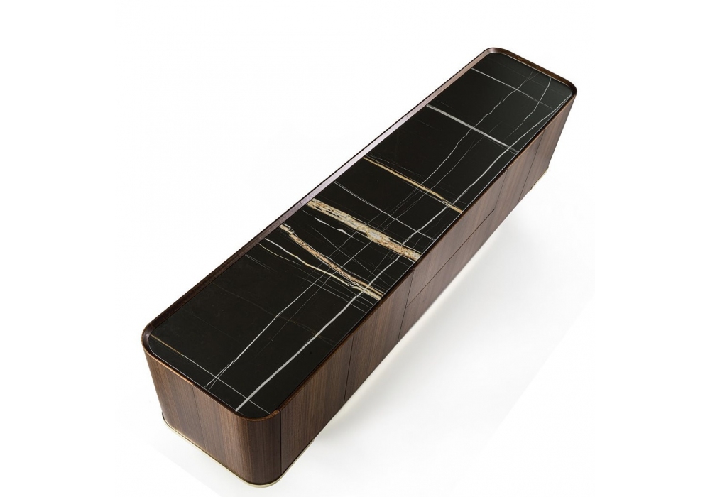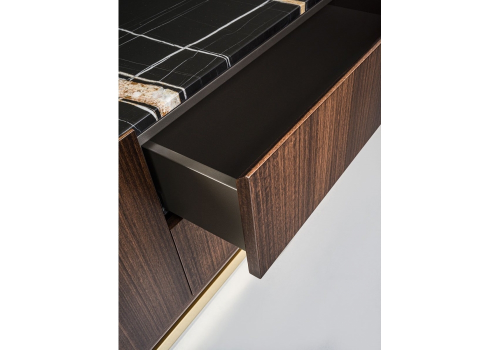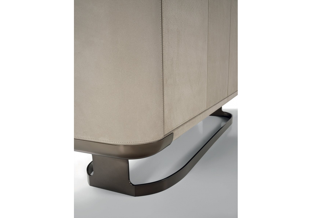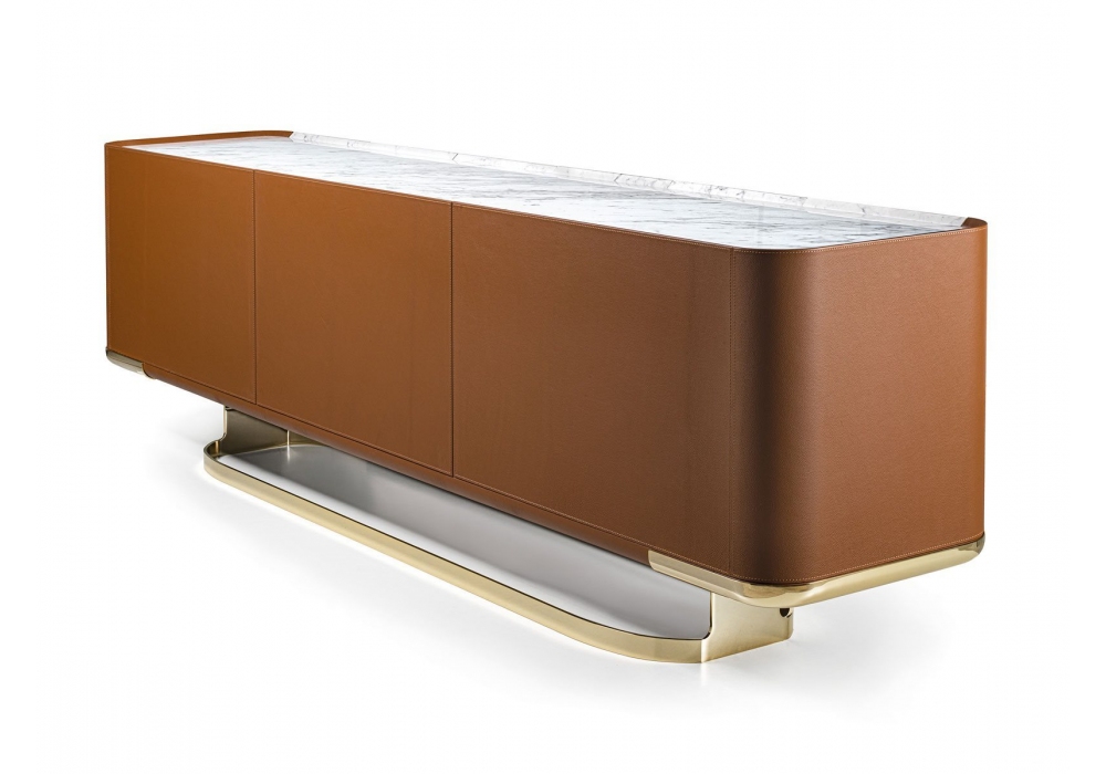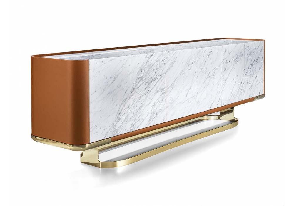 Concord firmata da Ben Wu per Longhi è una madia con base in metallo rettificato con taglio laser, scocca e frontali in pelle, tessuto o legno. Su richiesta è possibile realizzare le ante in marmo. Opzionale cassettino portaposate. Disponibile in differenti composizioni.