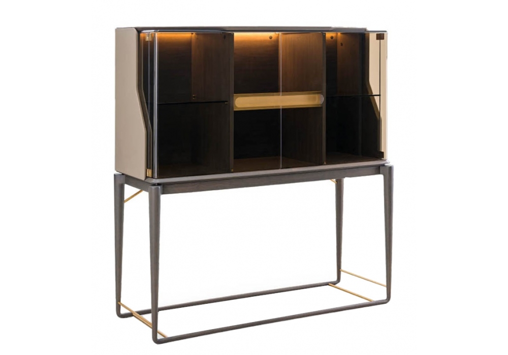 Vine firmata da Frank Jiang per Turri è una vetrina con struttura in MDF, multistrato, legno massello e pannelli di particelle di legno impiallacciato noce e due ante in vetro bronzato. Rivestimento in differenti pelli. All'interno sono presenti tre vani dotati ognuno di un ripiano in vetro bronzato. Illuminazione LED inclusa.