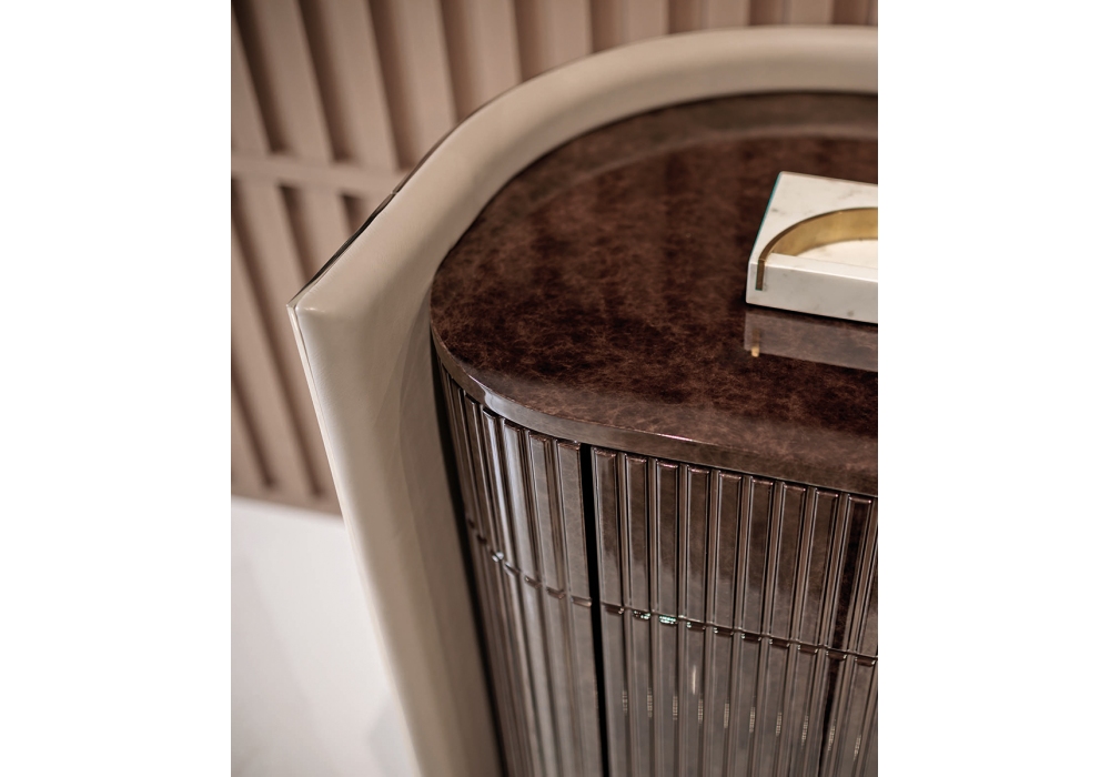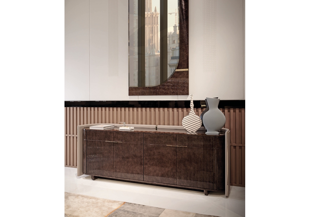 Eclipse firmata da Andrea Bonini per Turri è una madia con struttura in MDF e multistrato in finitura laccata lucida e scocca rivestita in pelle. All'interno sono presenti due vani dotati ognuno di un ripiano in vetro. Rivestimento pareti interne in microfibra. Le quattro ante in legno presentano una lesena decorativa.