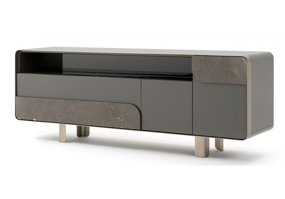 Soul firmata da Giuseppe Viganò per Turri è una credenza con struttura in MDF e pannelli di particelle di legno laccati lucidi. Parti metalliche in finitura opaca. Sono presenti due ante e un cassettone con dettagli decoartivi in legno di noce o marmo.