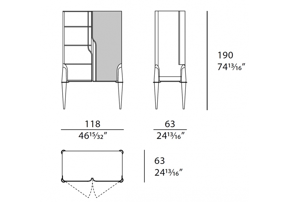 Melting Light Pelle firmata da Frank Jiang per Turri è una vetrina con struttura in MDF, multistrato, legno massello e pannelli di particelle di legno impiallacciato noce. Un'anta è realizzata in vetro bronzato, e l'altra è rivestita in differenti pelli. All' interno sono presenti due vani con tre ripiani in vetro ciascuno. Illuminazione LED.