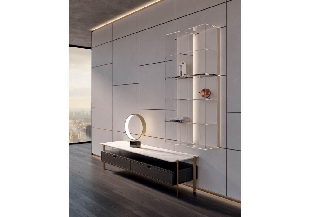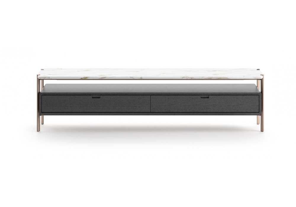 Eros firmata da Studio 63 per MisuraEmme è una madia caratterizzata da una struttura metallica in bronzo a sostegno del contenitore in essenza rovere nero e del top in marmo. Disponibile in due dimensioni.