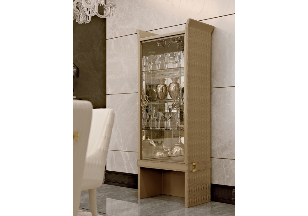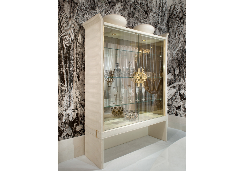 Numero Tre firmata da Roberto Serio per Turri è una vetrina con struttura in MDF, massello, multistrato e pannelli di particelle di legno in finitura laccata lucida con schienale rivestito interamente o parzialmente in pelle ricamata. All'interno è presente un vano con pareti a specchio bronzato con tre ripiani in vetro. Disponibile in diverse dimensioni.