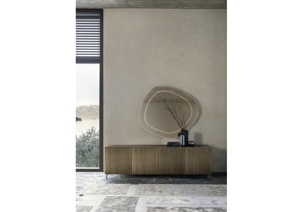 Onda firmata da Riflessi è una madia realizzata in legno laccato. Ante e fianchi sono lavorati con speciale incisione ondulata. I ripiani interni sono in cristallo trasparente. Apertura push-pull. Gli interni sono in finitura laccata RAL 7044. Disponibile in diverse dimensioni.