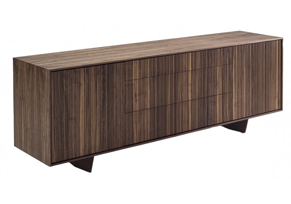 Vela firmata da Giuliano & Gabriele Cappelletti per Riva 1920 è una madia in legno massello e listellare, caratterizzata da una particolare lavorazione verticale di ante e frontali dei cassetti che crea un effetto geometrico moderno e dinamico. Cassetti assemblati con incastri a coda di rondine.