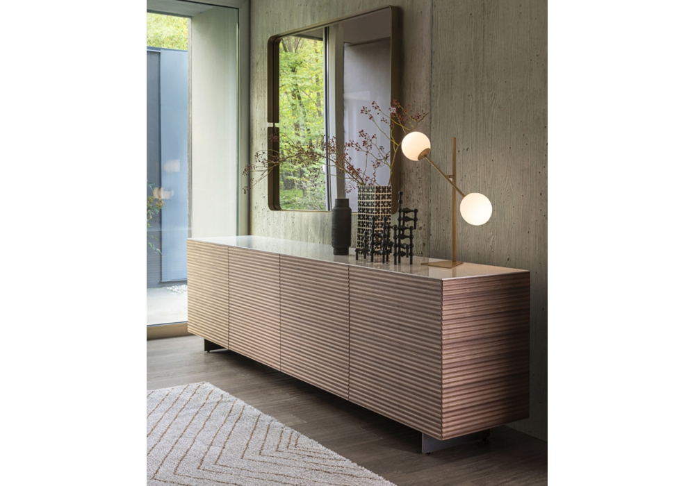 Dolce Vita firmata da Riflessi è una madia con struttura e ante in legno di noce canaletto con lavorazione speciale ondulata. Ripiani interni in cristallo trasparente. Apertura push-pull. Il piano può essere realizzato in legno di noce canaletto, in cristallo, ceramica o marmo. Disponibile in diverse dimensioni.