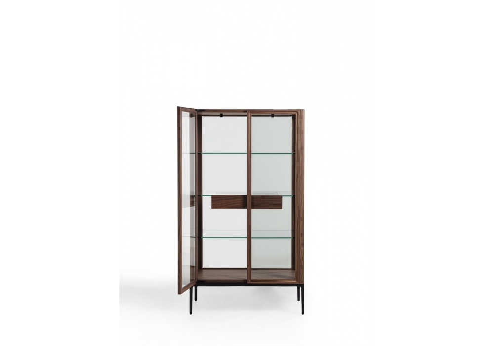 Atsuko firmata da D. Dolcini per Porada è una vetrina con struttura in massello di noce canaletta, cristalli trasparenti e base in metallo nero opaco. Cassetto interno in noce canaletta con guide in acero naturale. All’interno del cassetto sono previsti due vassoi in acero naturale con fondo rivestito in Cuoietto. Illuminazione a LED integrata dimmerabile tramite telecomando o APP.