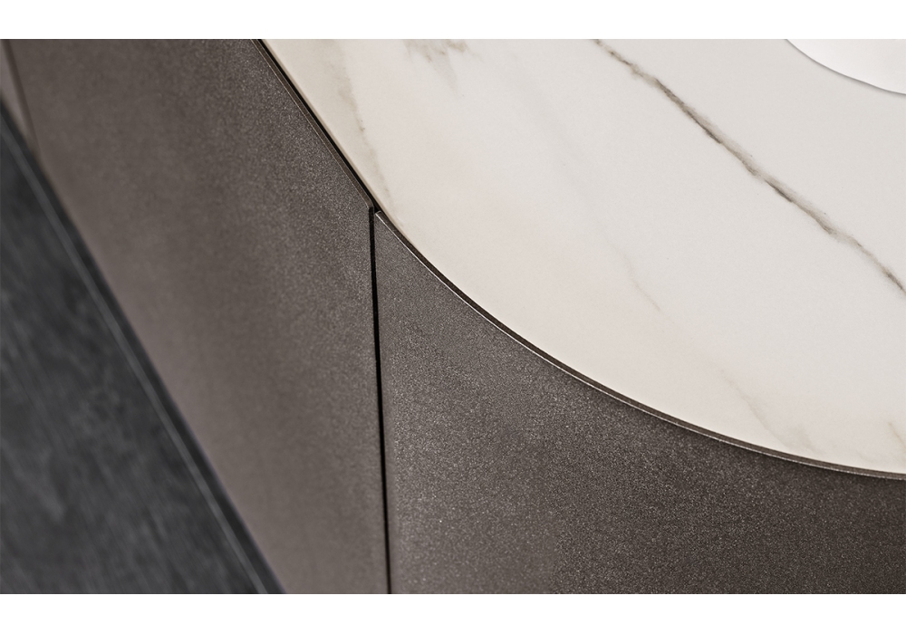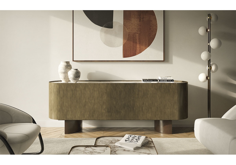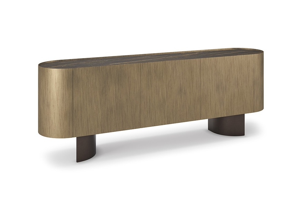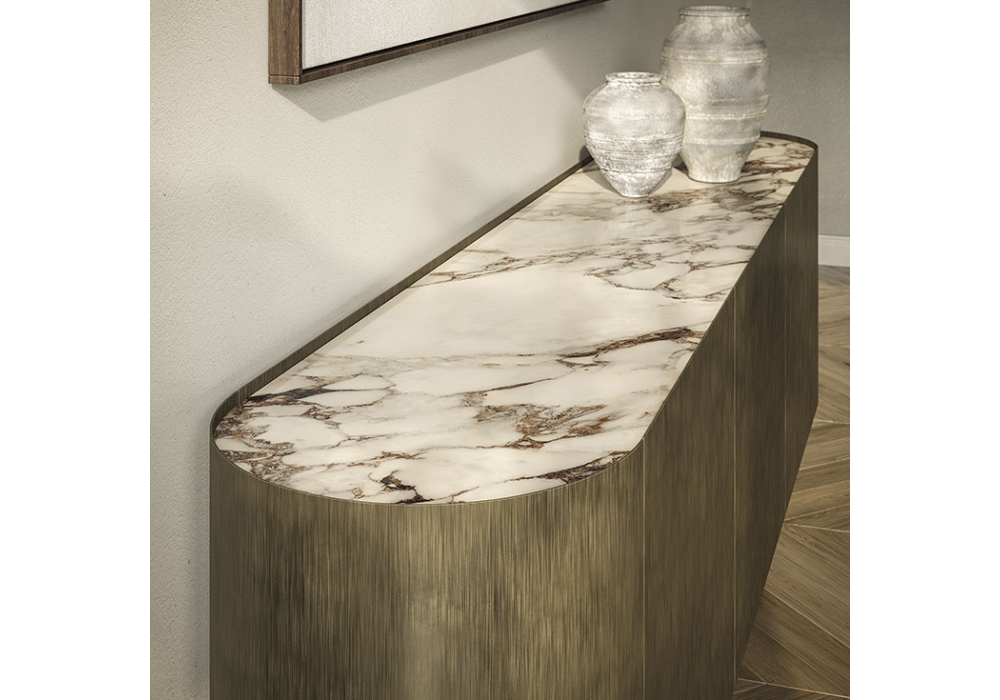 Savoy firmata da Giorgio Cattelan per Cattelan Italia è una madia contenitore con struttura in legno rivestita in metallo verniciato goffrato bronzo o Oxybrass. Top in cristallo specchiato bronzo o in ceramica Marmi, in diverse finiture, piedi in metallo verniciato goffrato bronzo.