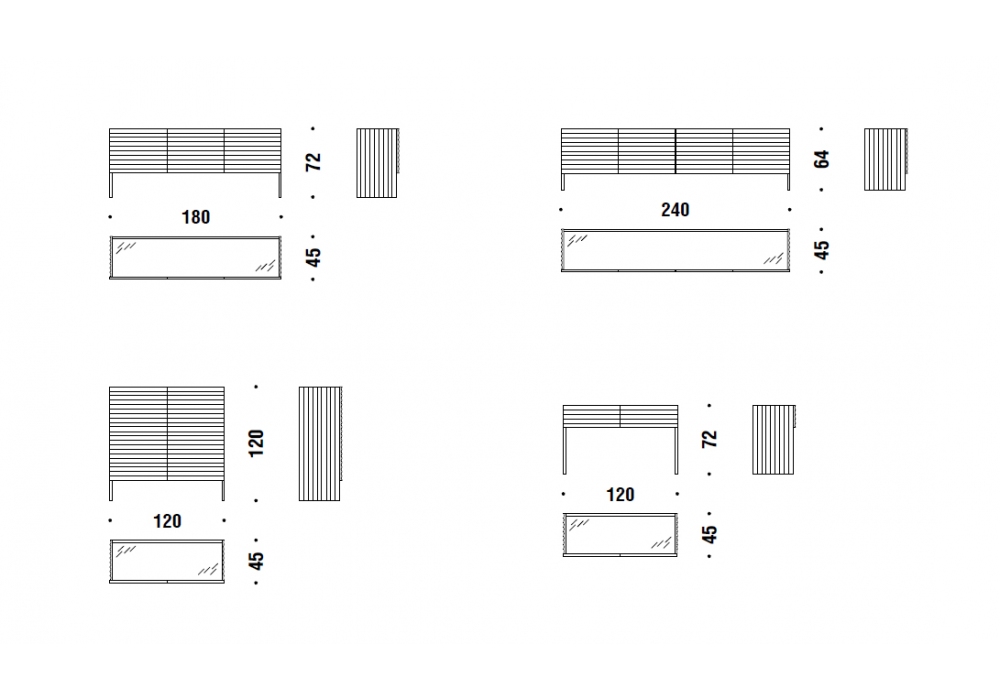 | Dimensioni | 180 x 45 x H 72 cm; 240 x 45 x H 64 cm; 120 x 45 x H 120 cm; 120 x 45 x H 72 cm |