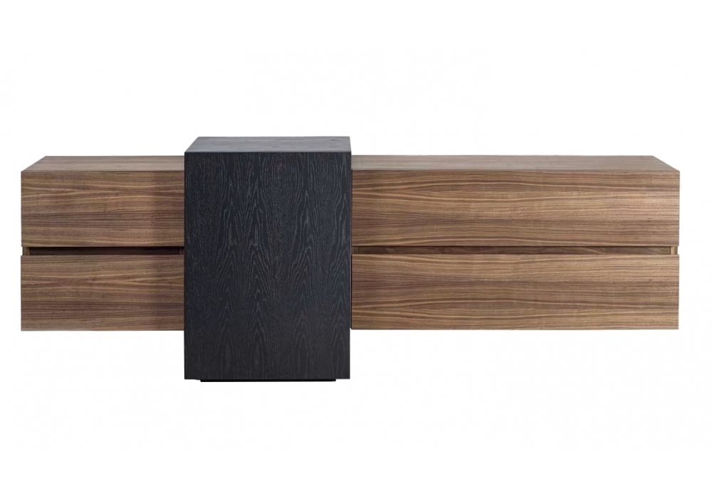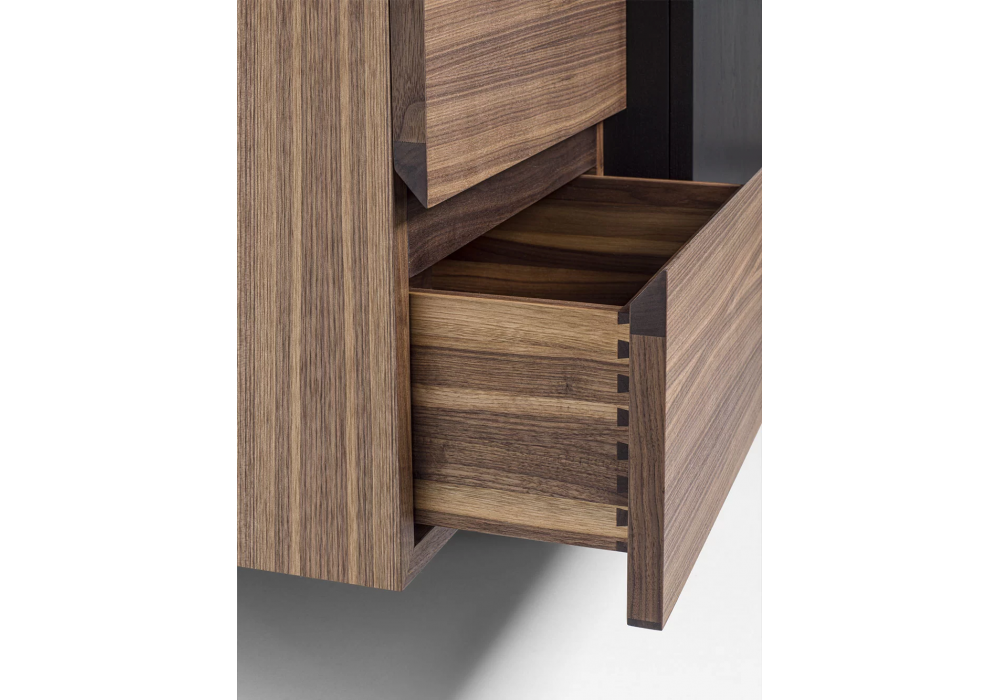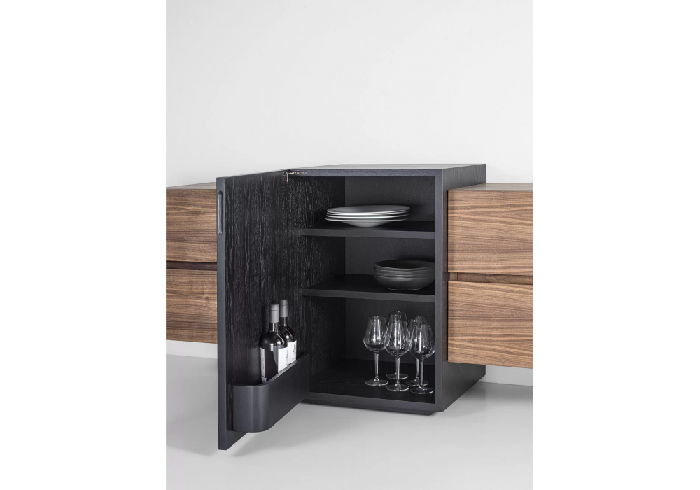 Aparadox firmata da Dsigno per Riva 1920 è una credenza realizzata in legno massello e listellare composta da tre moduli. Il modulo centrale con all'interno due ripiani, è caratterizzato da un'anta contenitiva, con portabottigle in massello, e sistema di chiusura ammortizzato. I moduli laterali, sospesi, sono costituiti da cassetti con tradizionale incastro a coda di rondine e maniglia fresata.