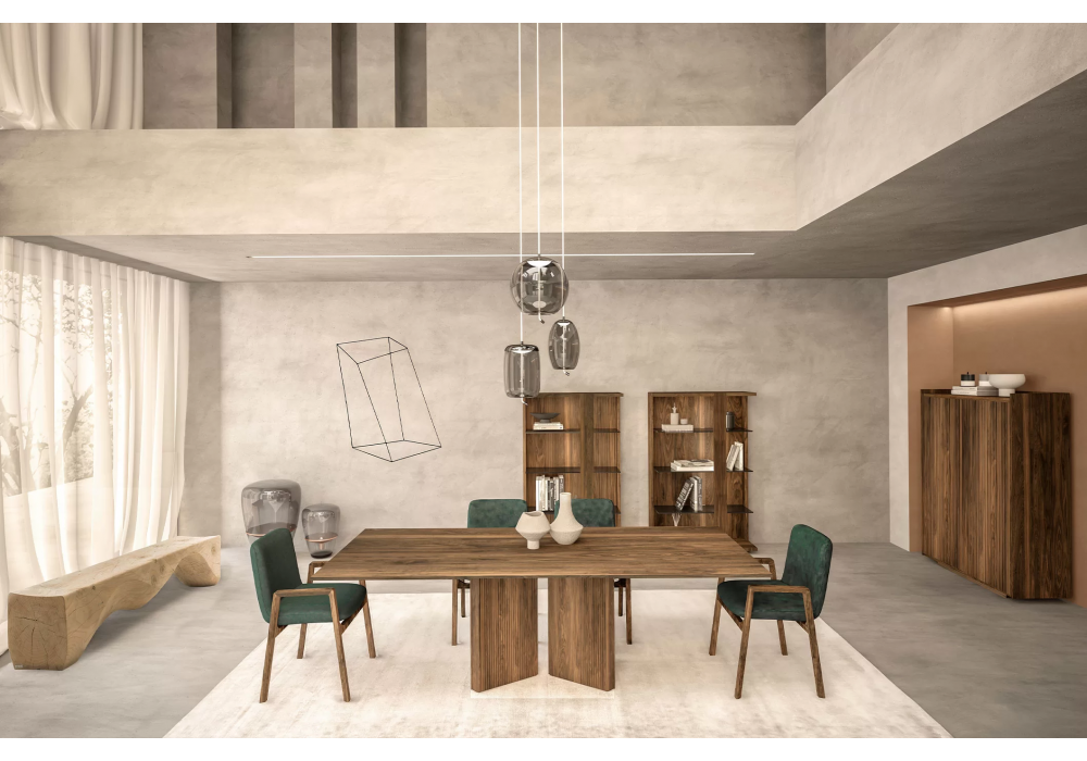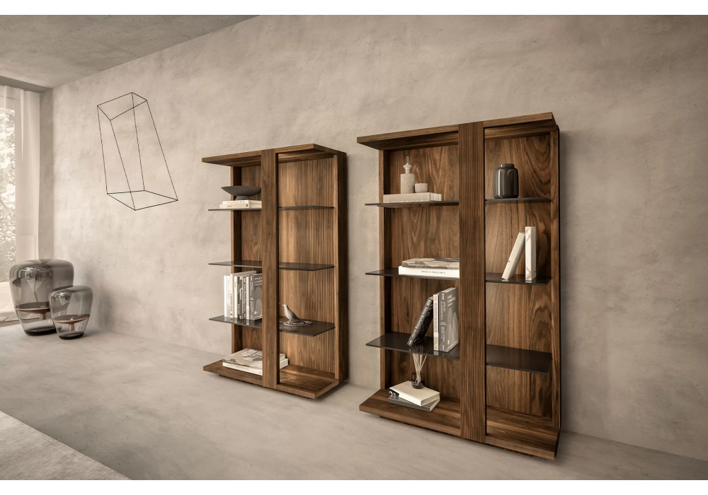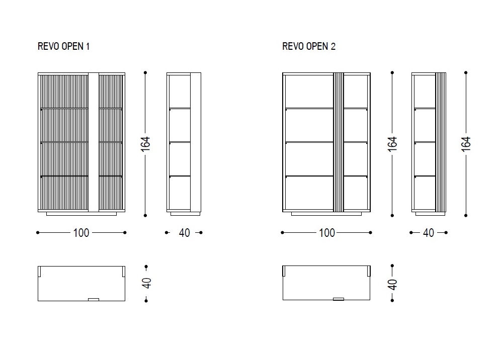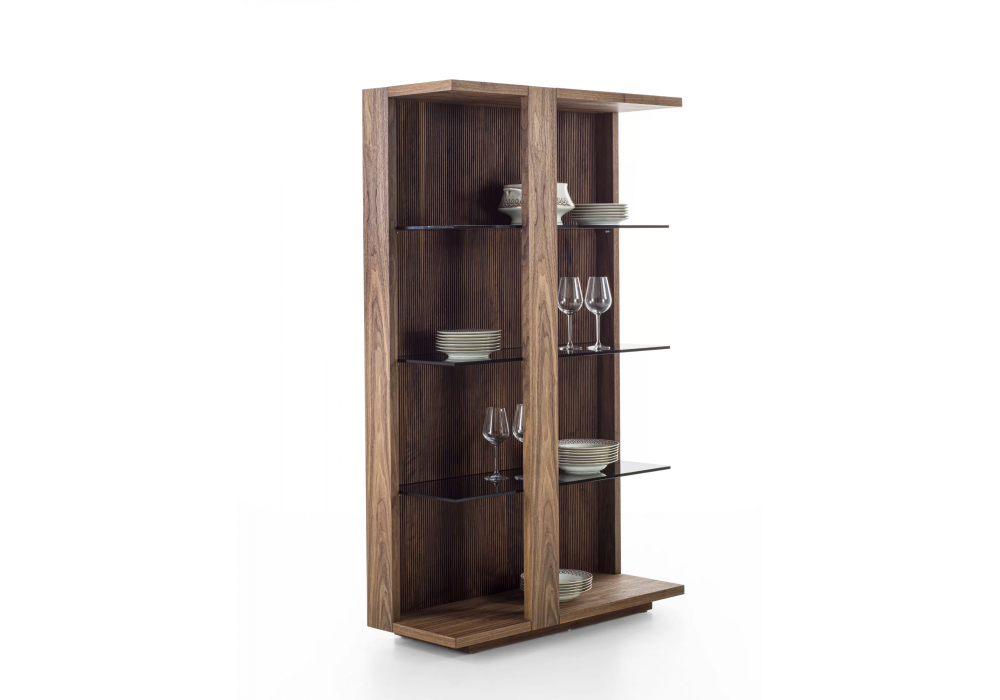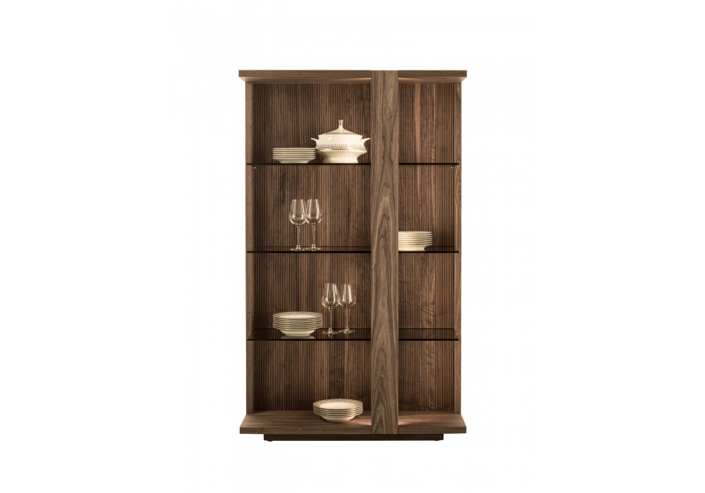 Revo Open firmata da Giuliano & Gabriele Cappelletti per Riva 1920 è una credenza alta in legno massello e listellare, dotata di tre ripiani in vetro. Top e base in legno. Disponibile in due versioni: con schienale caratterizzato da una particolare lavorazione verticale, Fresart, che crea un effetto geometrico moderno e dinamico oppure con decorazione Fresart applicata sulle tre fascie verticale perimetrali strutturali. Illuminata con sistema di luci LED con accensione tramite telecomando.