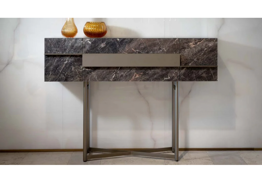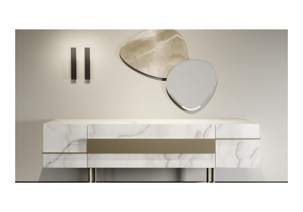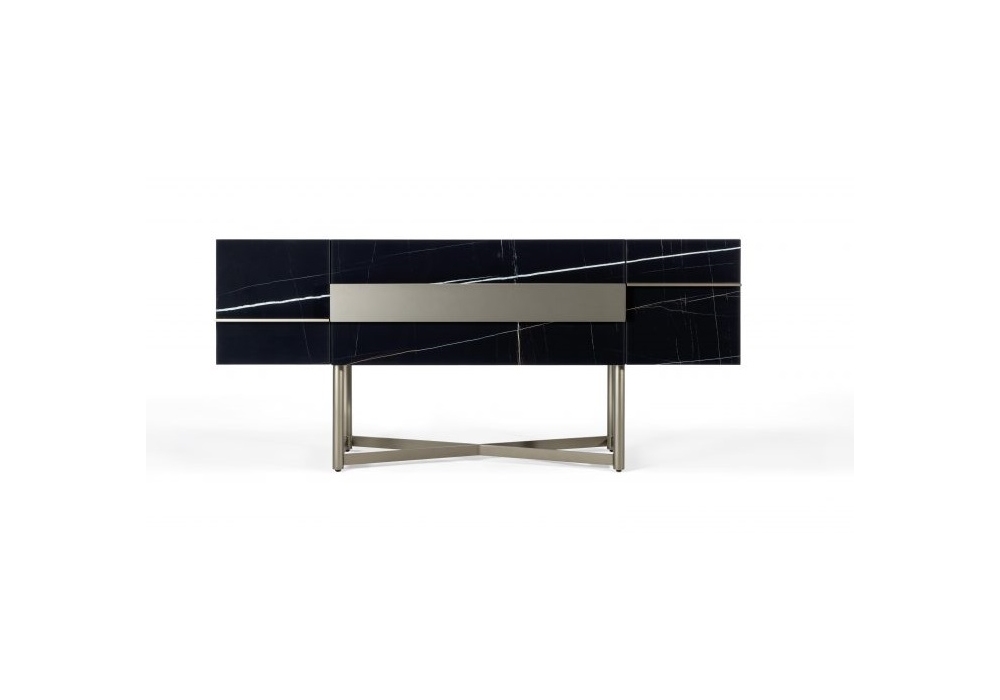 Musa firmata da Lino Codato per Reflex Angelo è una credenza con struttura in legno legno rivestito in Marmoreflex/Legnoreflex. Dettagli maniglia e base in metallo finitura Bronzo.