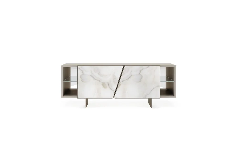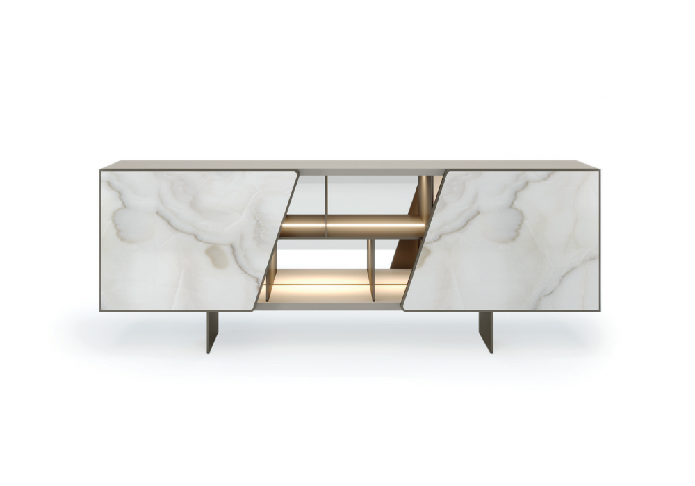 Vertigo firmata da Riccardo Lucatello per Reflex Angelo è una credenza con struttura in legno laccato con 2 ante scorrevoli in legno finitura Bronzo con inserto MarmoReflex o LegnoReflex. Schienale in specchio fumé. Ripiani laterali in vetro trasparente. Gambe in metallo. Ripiani nel vano a giorno in legno laccato in tinta con la struttura, in Bronzo o in metallo satinato.