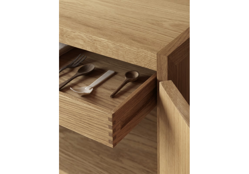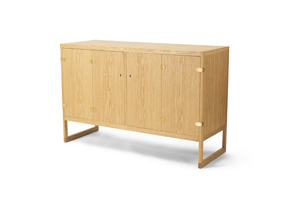 BM0057 firmata da Børge Mogensen per Carl Hansen & Son è una madia realizzata in legno di rovere in finitura olio o olio bianco. Maniglie e cardini in ottone.