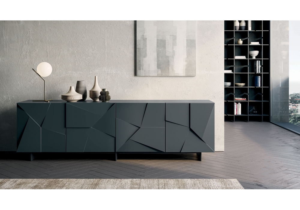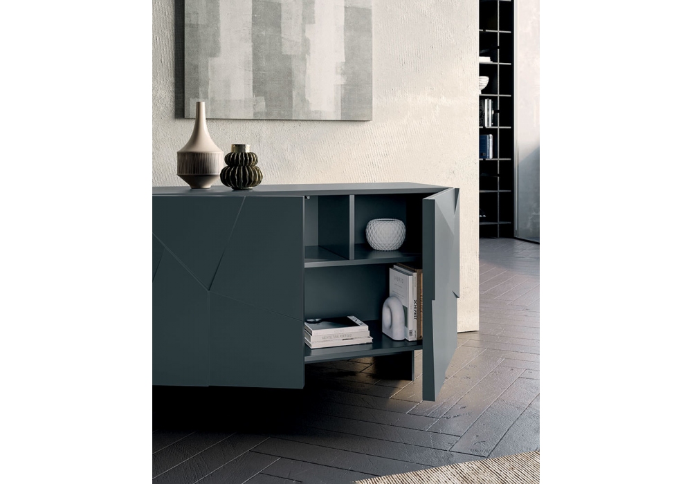 Concrete firmata da Dall'Agnese è una madia realizzata in pannelli di particelle di legno. L’esterno è disponibile in laccato opaco o in superfici up, mentre l’interno è in materico avana, con possibilità di finitura in laccato opaco su richiesta. Struttura esterna e vano interno in legno. I frontali presentano ante pantografate e sfaccettate, con apertura esclusivamente push and pull. Disponibile con basamento Lama e Tube oppure con piedini.