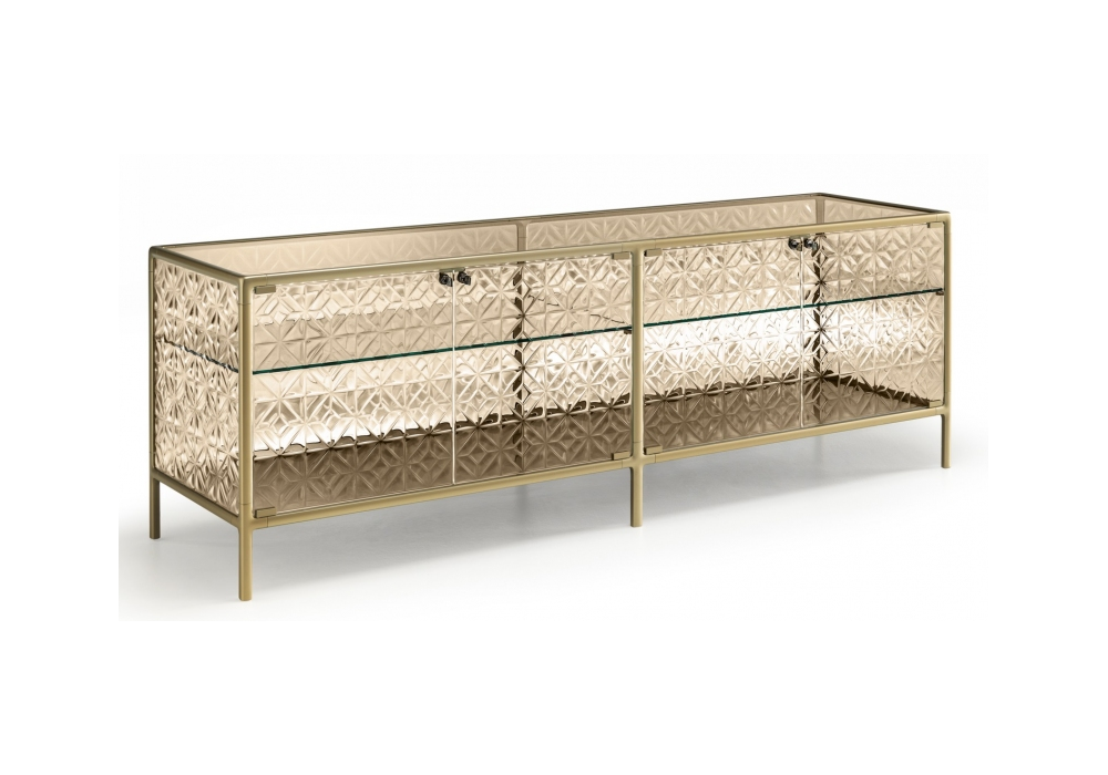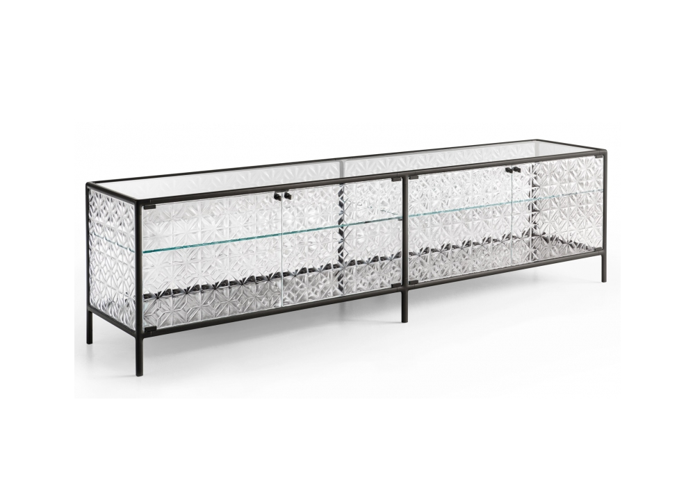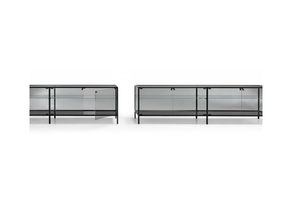 Echo firmata da Marcel Wanders Studio per Fiam è una madia con struttura in alluminio verniciato, base in vetro extralight retroverniciato in tinta con la struttura, corpo vetrina ed anta in vetro. Disponibile anche nella versione con sistema di illuminazione LED integrato nei montanti frontali.