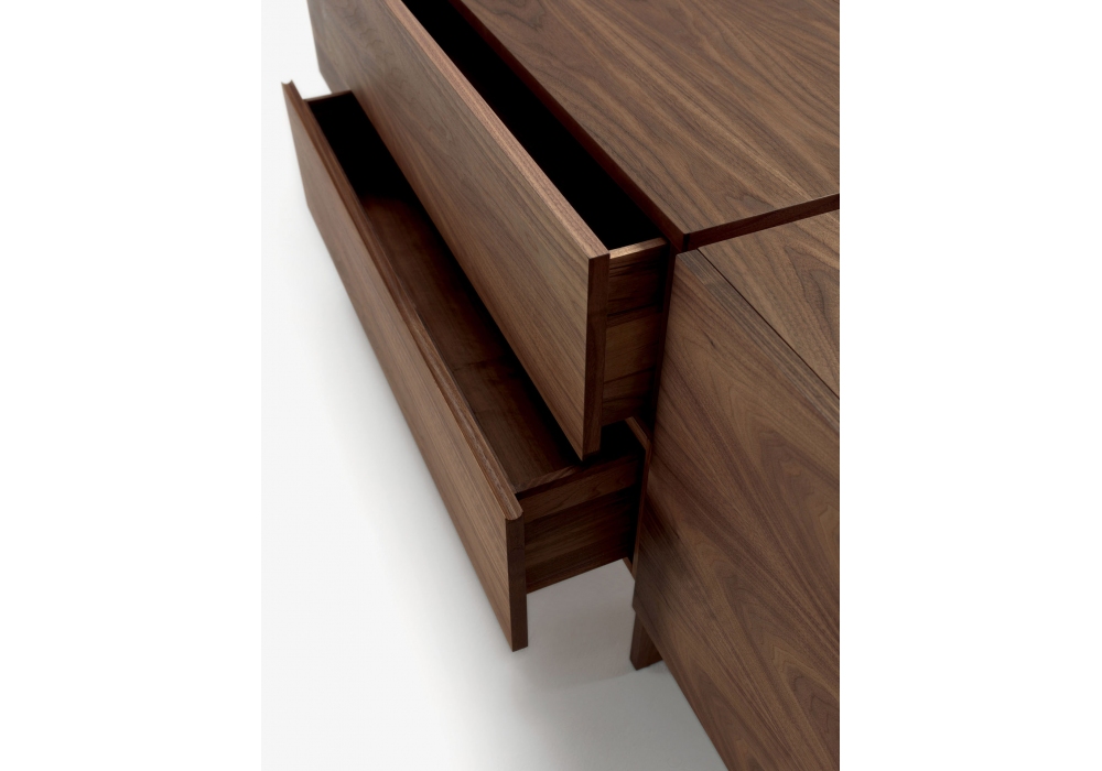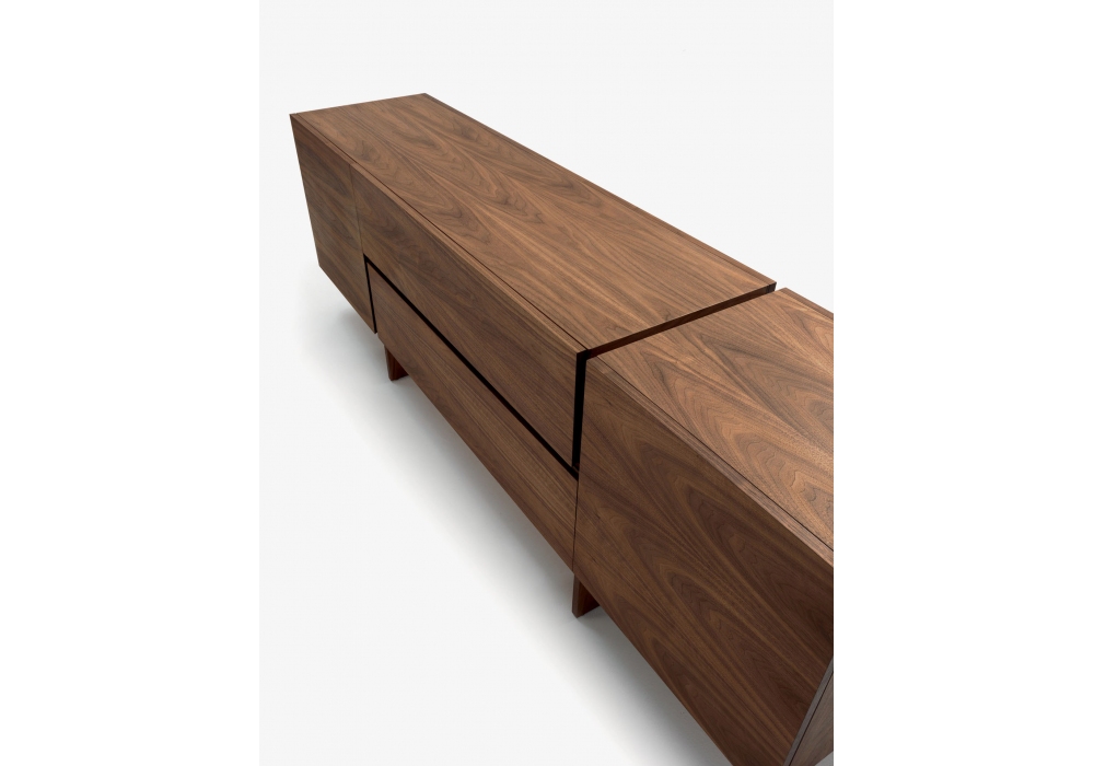 Aki firmata da Bartoli Design per Riva 1920 è una madia in legno massello e listellare, caratterizzata da ante a battente e cassetti assemblati con incastro a coda di rondine. Disponibile in diverse finiture.