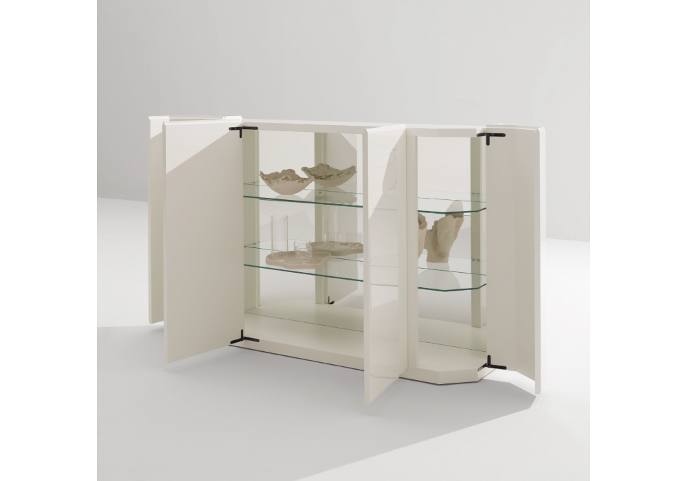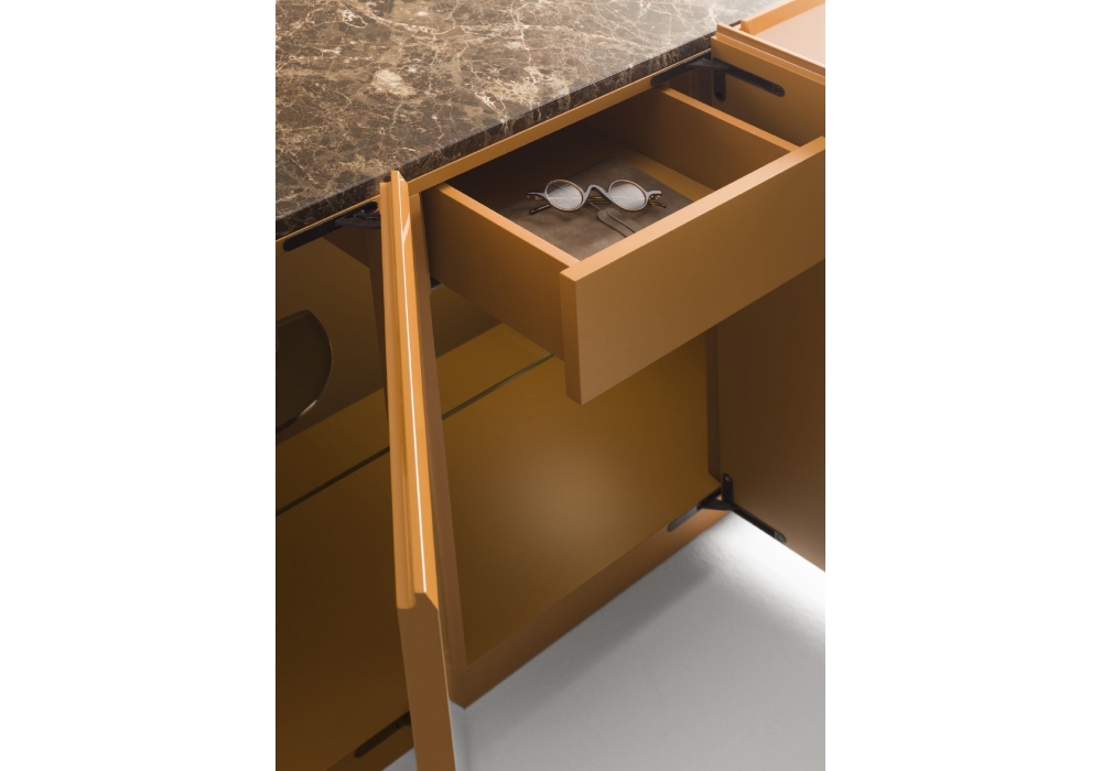 Cross, progettata e firmata da R&S Désirée, è una madia dal volume contenitivo compatto, ispirata alla profondità delle bow-window. La struttura, le superfici laccate e il piano si integrano in una composizione armonica, scandita da bisellature e incavi che ne definiscono il ritmo formale. Il piano in marmo accentua la matericità dell’insieme, conferendo al progetto un carattere solido ed elegante.