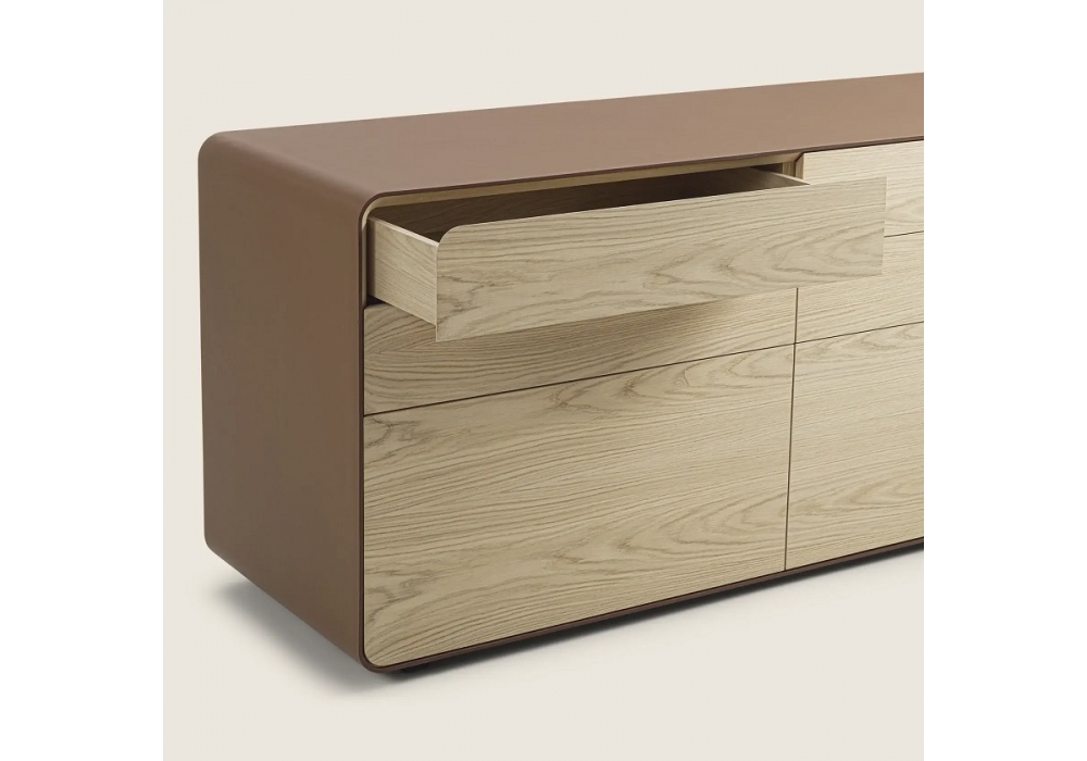 Clarence firmata da Antonio Citterio per Flexform è un madia con struttura in legno, disponibile in diverse finiture. Rivestimento in cuoio in diversi colori. Appoggio a terra su piedi in legno verniciati nero opaco. Disponibile in diversi modelli.