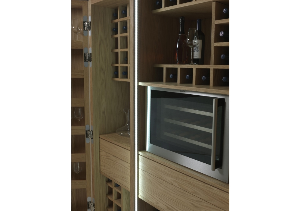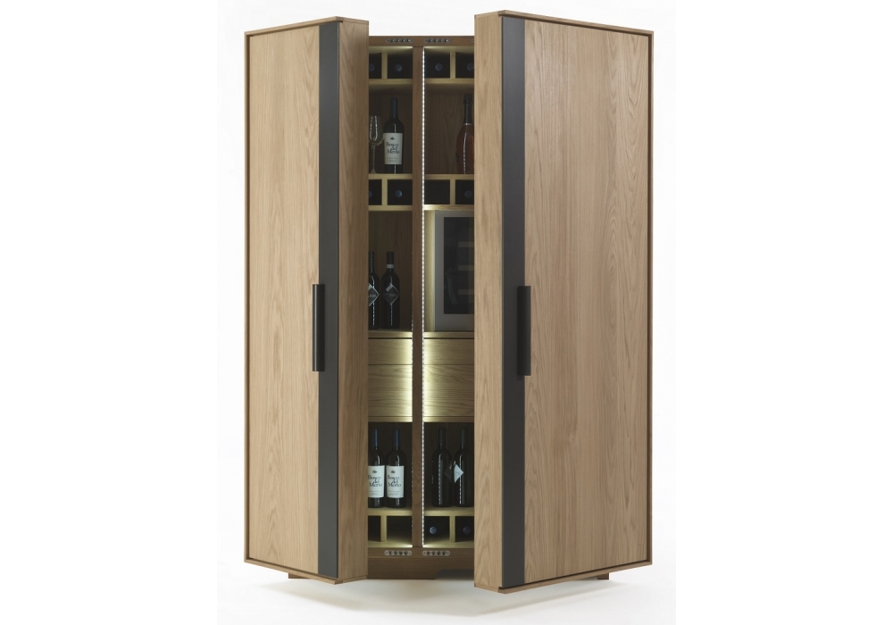 Cambusa Wine Jumbo firmato da Giuliano Cappelletti per Riva 1920 è un mobile contenitore multifunzione in listellare e massello dotato di doppia anta con angolo di apertura a 180°. L’allestimento interno prevede vani contenitori porta bottiglie e bicchieri, con possibilità di inserire piccoli elettrodomestici. L'interno del mobile è illuminato per mezzo di strisce a LED posizionate sulla spalla centrale, la cui accensione risulta automatica tramite sensori che si attivano all’apertura delle ante.