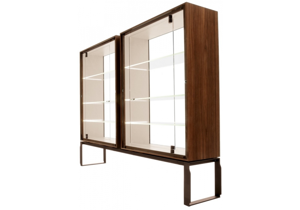 Aei firmata da Chi Wing Lo per Giorgetti è una vetrina in noce canaletto costituita da due elementi verticali. Le parti interne sono disponibili in due versioni: Sycomore frisè tinto bianco o decorazione dorata in foglia. Le ante, lo schienale e i ripiani sono in cristallo temperato. Questi ultimi sono illuminati da LED con accensione grazie a un telecomando in dotazione. Le cerniere, i pomoli delle ante e il basamento sono in metallo verniciato color bronzo.