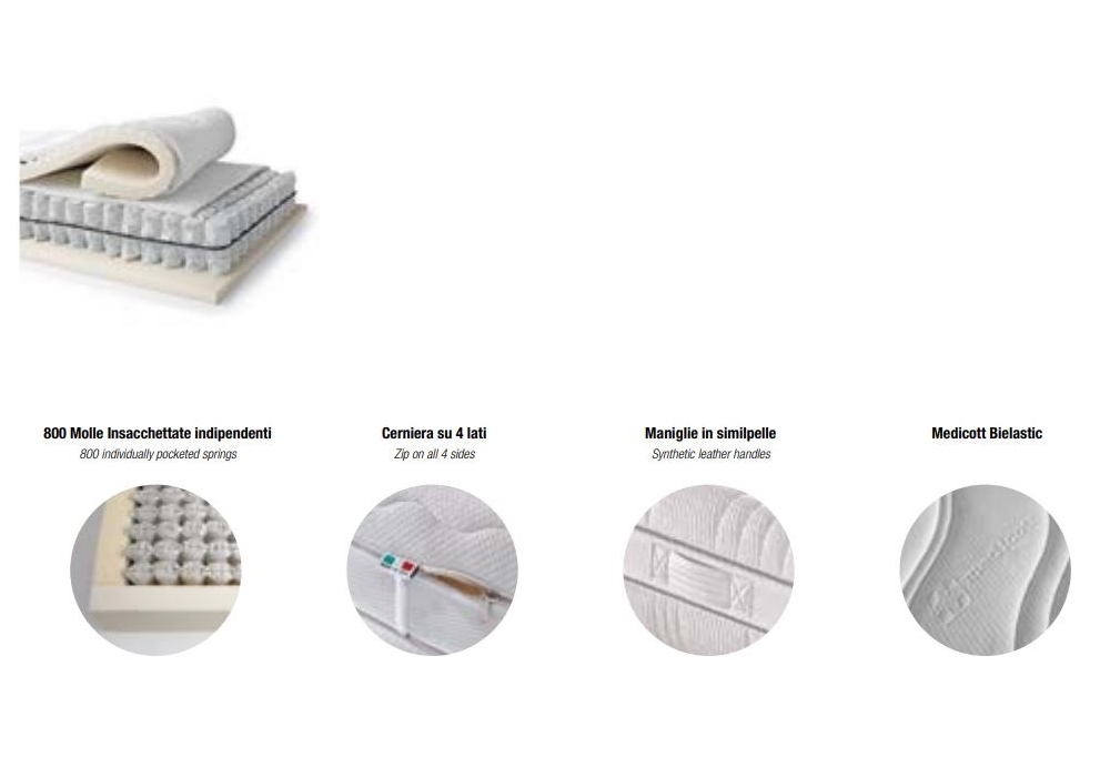Deluxe Medicott® firmato e prodotto da Twils è un materasso con 800 molle insacchettate indipendenti, dotato di cerniera su 4 lati e maniglie laterali in similpelle. Contiene box Aquatech con lastre bugnate e longheroni laterali rinforzati. Fodera esterna rimovibile in tessuto Medicott Bielastic. Disponibile in più dimensioni. Alto 23 cm.