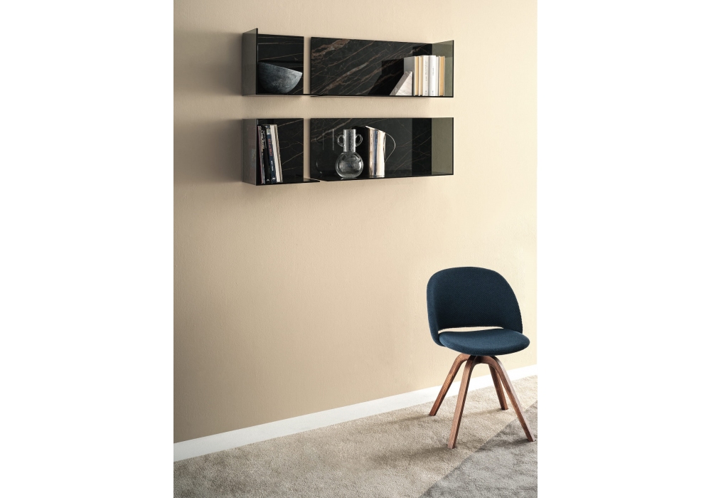 09.52 Zen firmata da Bontempi è una composizione di mensole composta da top e fianco in cristallo e schienale in marmo.