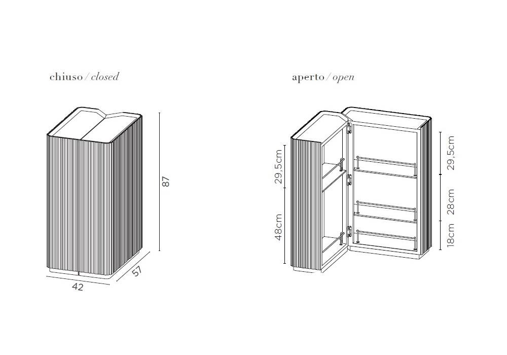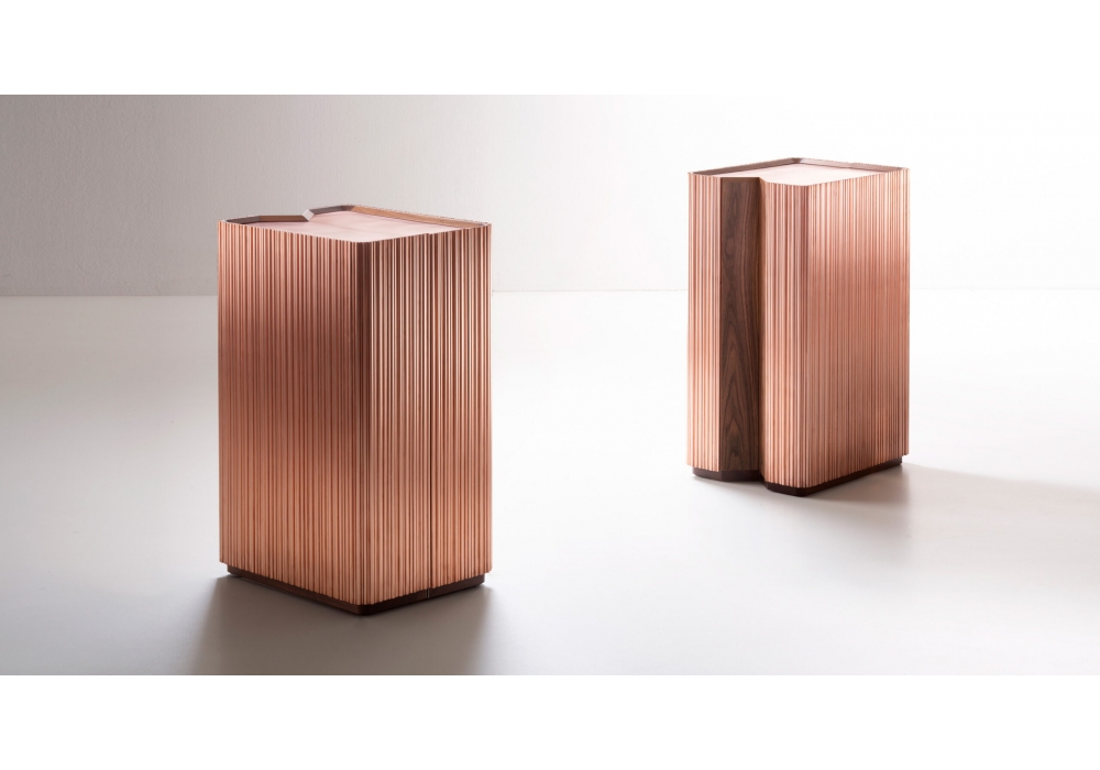 Barista firmato da Adriano Design per DeCastelli è un mobile bar realizzato con struttura in legno rivestito con tubolari in rame di diverso diametro. Apertura a libro mediante rotelle nascoste alla base. Cinque ripiani in vetro e rivestimento interno in acciaio inox lucido.