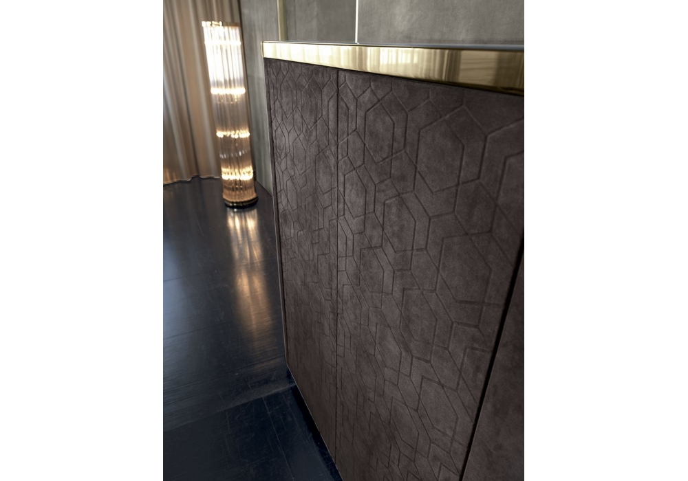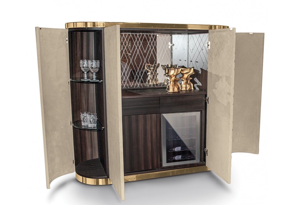 Beverly firmato da Giuseppe Iasparra per Longhi è un mobile bar con rivestimento in pelle o cashmere. Finitura interna legno zebrano tinto scuro, mensole in vetro trasparente e due cassetti. Piano in specchio e base e bordi in metallo rettificato. Come accessorio è possibile aggiungere una mini cantinetta frigo per vini. Disponibile nella versione con rivestimento liscio o con decoro in rilievo Sequence o Diamond. Su richiesta è posibile aggiungere uno specchio laserato LED a luce fredda.