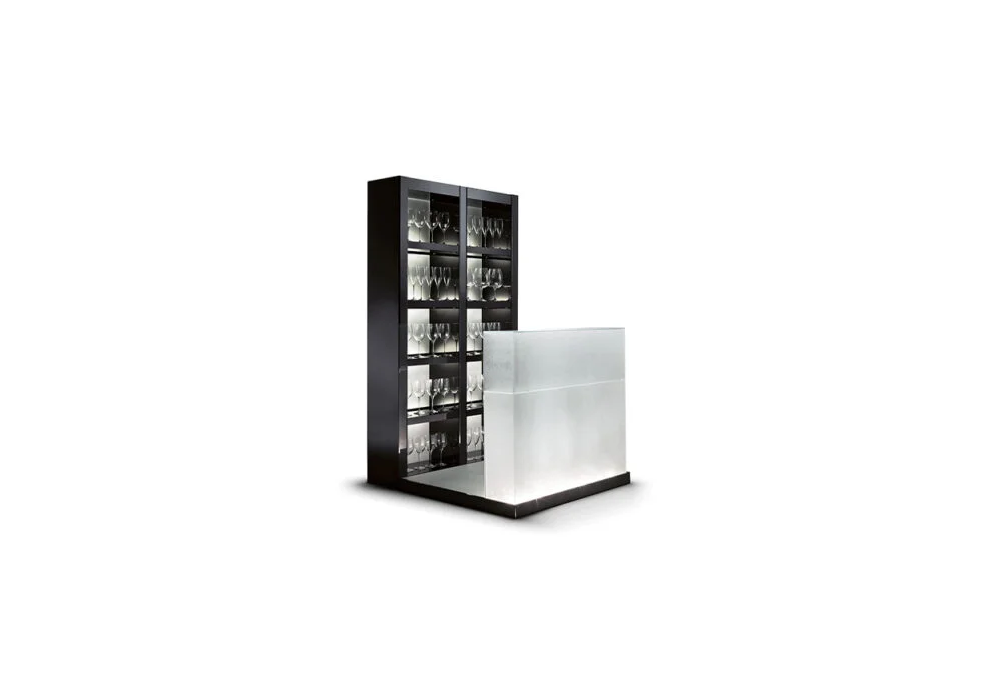 Avantgarde firmato da Reflex Angelo è un mobile bar composto da: mobile a parete versione speciale Avantgarde libreria in legno laccato lucido con applicazioni di vetro bisellato laccato sui frontali e schienale in vetro laccato bianco, specchio fumé, noce Canaletto o in vetro Marmo, con 2 ripiani lunghi e 4 ante; bancone bar con luce in extrachiaro, bronzo o fumé con finitura satinata e bocciardata oppure in vetro con decoro Vienna; pedana in finitura lucida abbinata alla libreria. Optional portaoggetti refrigerato e illuminazione a Led sui ripiani.