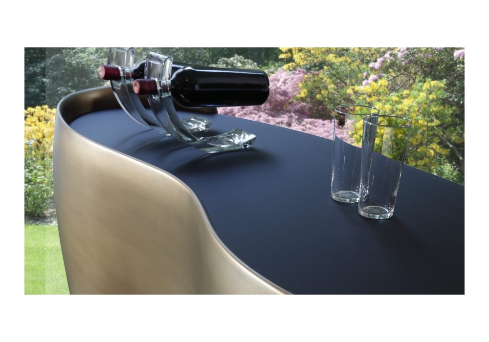 Coco De Mer disegnato da Riccardo Lucatello per Reflex Angelo è un bancone/bar sagomato in finitura laccata opaca o in finitura ottone satinato, ottone dark, titanio o titanio dark. Piano in vetro laccato e ripiano in vetro trasparente. Poggiapiedi opzionale in acciaio.