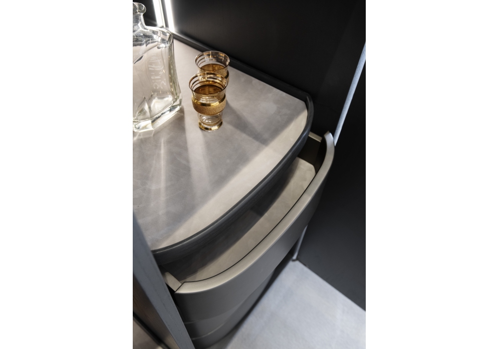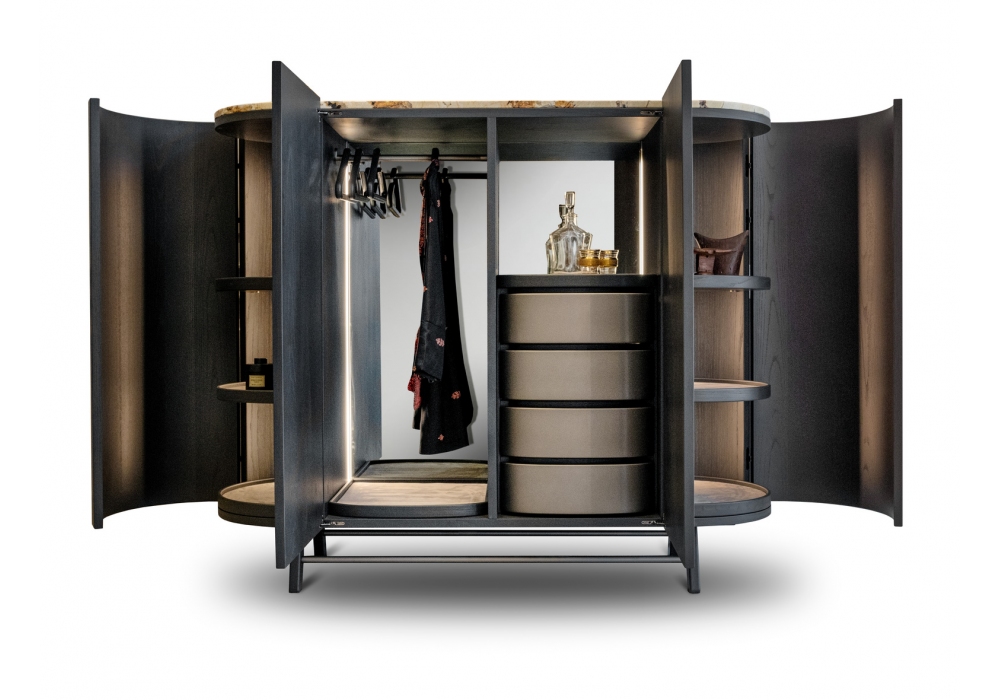 Tako firmato da Setsu & Shinobu Ito + Leonardo Mercurio per Conte Casa è un mobile bar realizzato con struttura in legno e piano in marmo. Cassettiera in legno essenza, laccato opaco o metallico e mensole in pelle nabuk, marmo o in legno in tinta con la struttura. Può essere configurato in due modi o mobile bar o guardaroba ma all'occorrenza anche avere entrambe le versioni in un unico prodotto.