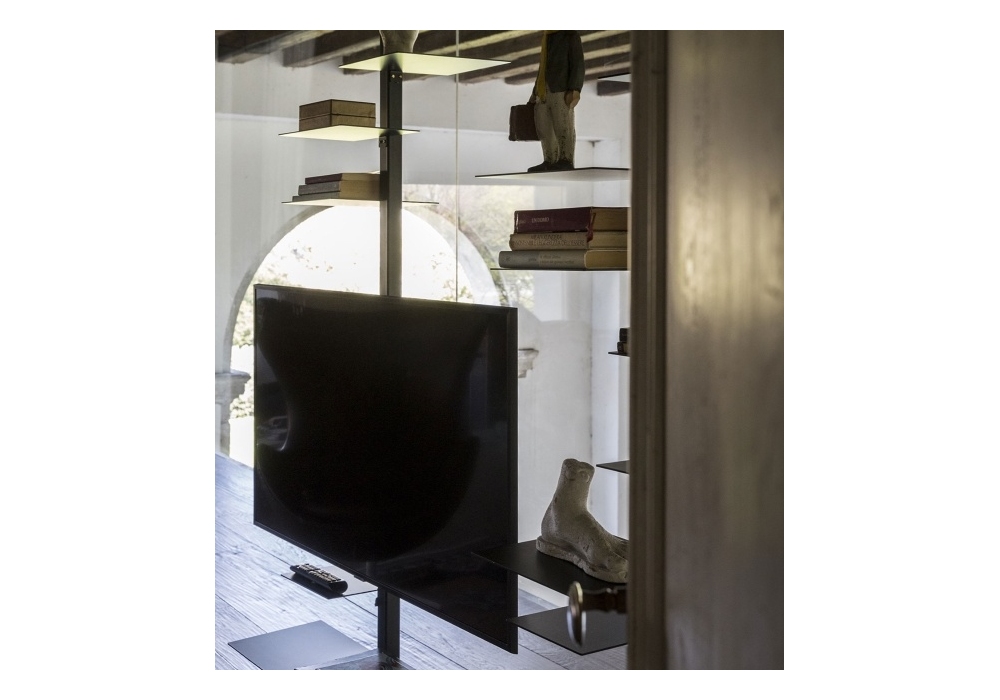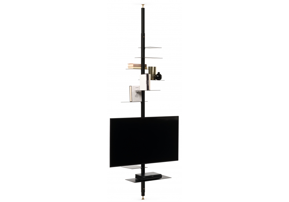 Adelaide Metal firmato da Claudio Bitetti per Mogg è un porta tv con struttura predisposta per passaggio cavi e 10 ripiani. Predisposta per il montaggio a soffitto. Piedini e viti in finitura ottone. Televisori MAX 65 pollici.