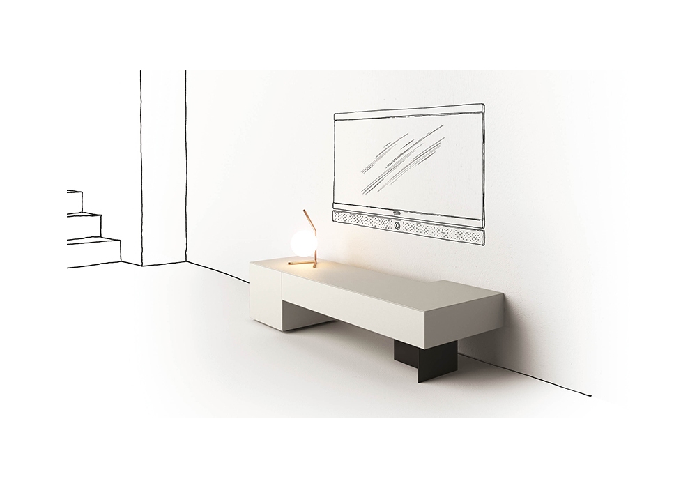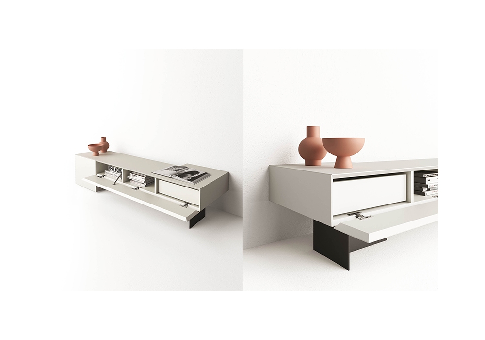 Formosa Distesa firmato da DSH per Minotti Italia è un contenitore / porta tv in legno, finitura goffrata in diversi colori, disponibile anche in foglia oro o argento. Composto da un'anta battente, un'anta ribalta e un cassetto interno, piedini regolabili e piede in lamiera laccato nero opaco. Apertura a destra o sinistra. Possibilità di includere opzione luce LED.