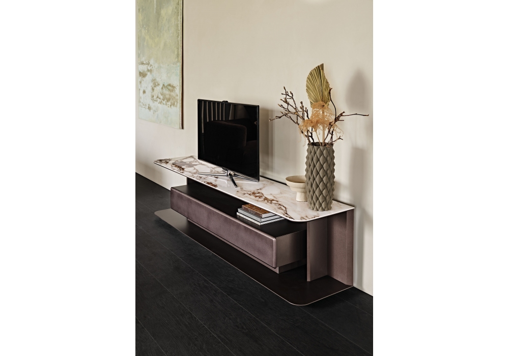 Award firmato da Paolo Cattelan per Cattelan Italia è un mobile porta TV con anta a ribalta. Struttura in legno nella finitura laccato goffrato titanio o bronzo. Piano in ceramica Marmi disponibile in diversi colori.